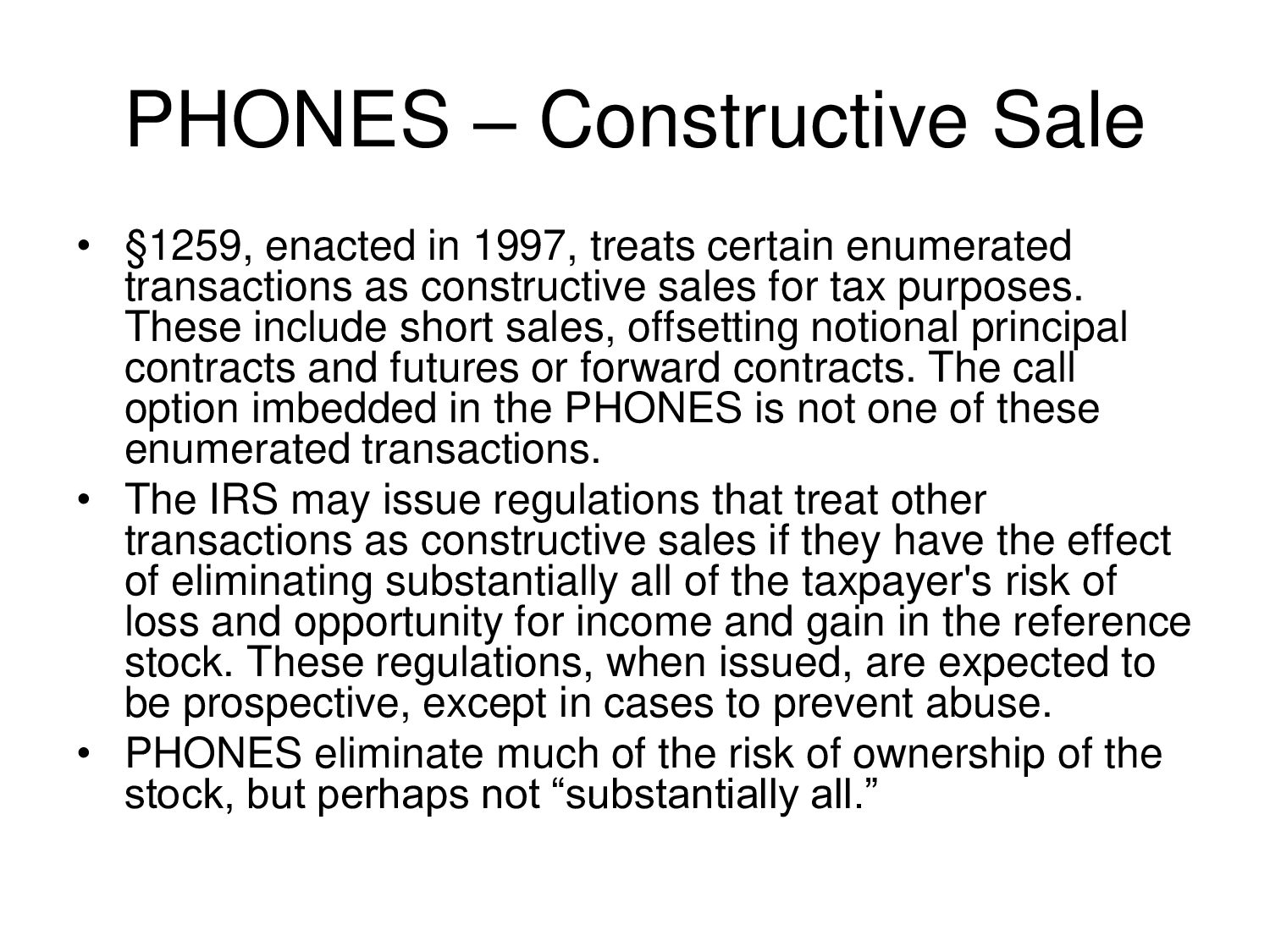 certain enumerated transactions as constructive sales for tax purposes. These include short sales, offsetting notional principal contracts and futures or forward contracts. The call option imbedded in the PHONES is not one of these enumerated transactions. • The IRS may issue regulations that treat other transactions as constructive sales if they have the effect of eliminating substantially all of the taxpayer's risk of loss and opportunity for income and gain in the reference stock. These regulations, when issued, are expected to be prospective, except in cases to prevent abuse. • PHONES eliminate much of the risk of ownership of the stock, but perhaps not “substantially all.”