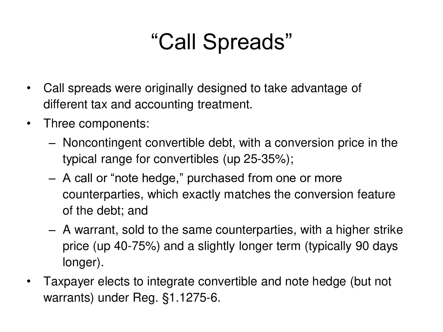 advantage of different tax and accounting treatment. • Three components: – Noncontingent convertible debt, with a conversion price in the typical range for convertibles (up 25-35%); – A call or “note hedge,” purchased from one or more counterparties, which exactly matches the conversion feature of the debt; and – A warrant, sold to the same counterparties, with a higher strike price (up 40-75%) and a slightly longer term (typically 90 days longer). • Taxpayer elects to integrate convertible and note hedge (but not warrants) under Reg. §1.1275-6.