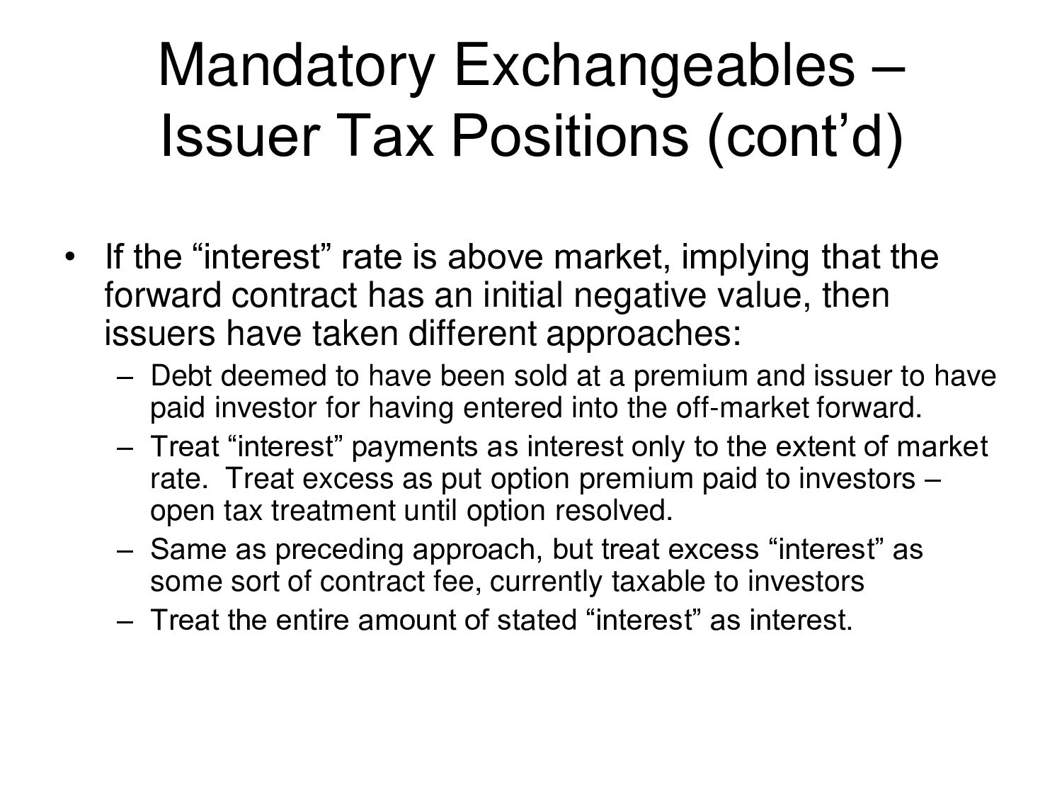 “interest” rate is above market, implying that the forward contract has an initial negative value, then issuers have taken different approaches: – Debt deemed to have been sold at a premium and issuer to have paid investor for having entered into the off-market forward. – Treat “interest” payments as interest only to the extent of market rate. Treat excess as put option premium paid to investors – open tax treatment until option resolved. – Same as preceding approach, but treat excess “interest” as some sort of contract fee, currently taxable to investors – Treat the entire amount of stated “interest” as interest.