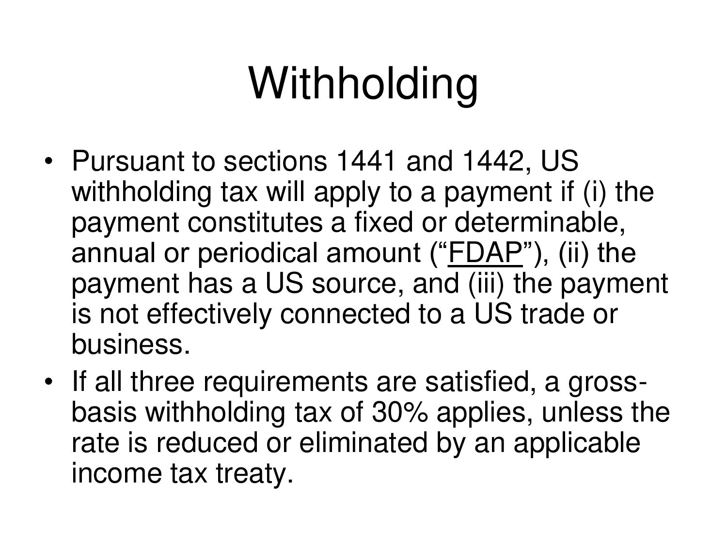 tax will apply to a payment if (i) the payment constitutes a fixed or determinable, annual or periodical amount (“FDAP”), (ii) the payment has a US source, and (iii) the payment is not effectively connected to a US trade or business. • If all three requirements are satisfied, a gross- basis withholding tax of 30% applies, unless the rate is reduced or eliminated by an applicable income tax treaty.