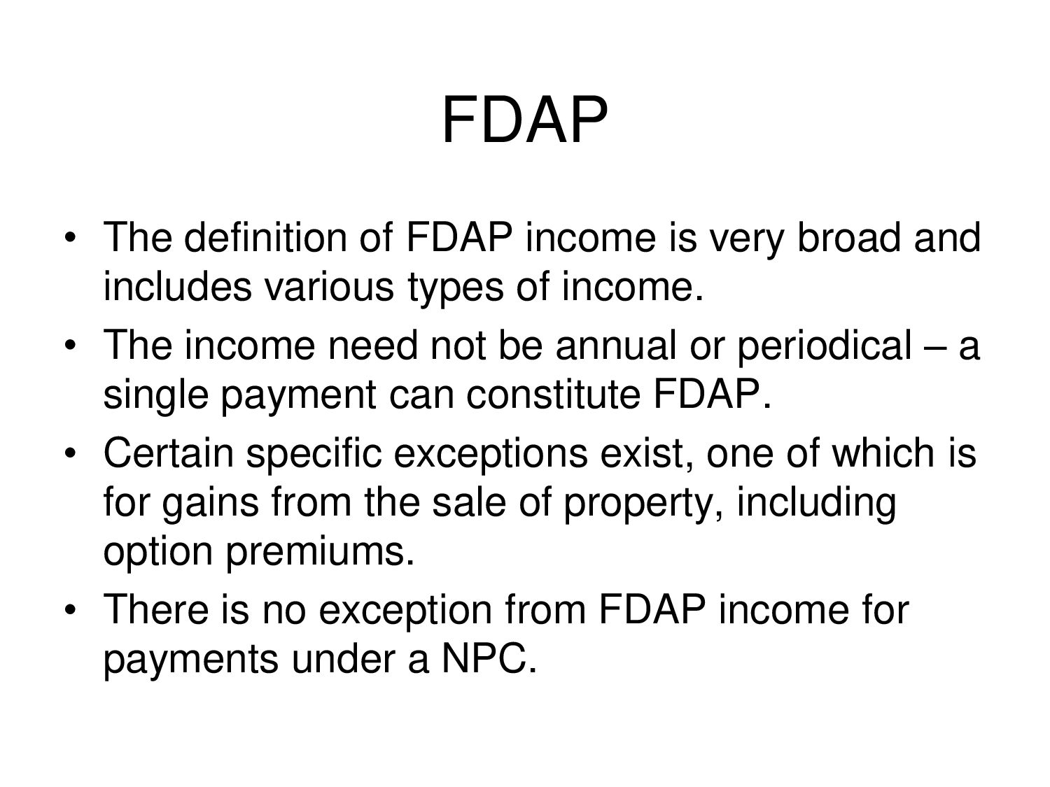 and includes various types of income. • The income need not be annual or periodical – a single payment can constitute FDAP. • Certain specific exceptions exist, one of which is for gains from the sale of property, including option premiums. • There is no exception from FDAP income for payments under a NPC.
