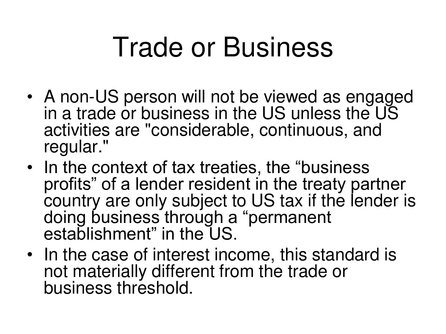 viewed as engaged in a trade or business in the US unless the US activities are "considerable, continuous, and regular." • In the context of tax treaties, the “business profits” of a lender resident in the treaty partner country are only subject to US tax if the lender is doing business through a “permanent establishment” in the US. • In the case of interest income, this standard is not materially different from the trade or business threshold.