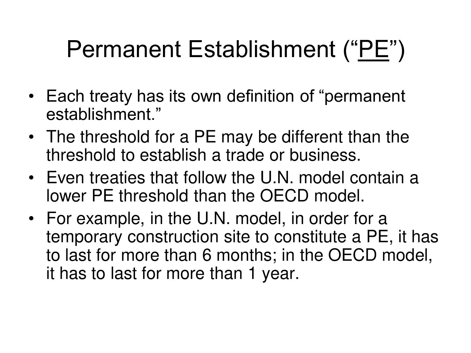 of “permanent establishment.” • The threshold for a PE may be different than the threshold to establish a trade or business. • Even treaties that follow the U.N. model contain a lower PE threshold than the OECD model. • For example, in the U.N. model, in order for a temporary construction site to constitute a PE, it has to last for more than 6 months; in the OECD model, it has to last for more than 1 year.