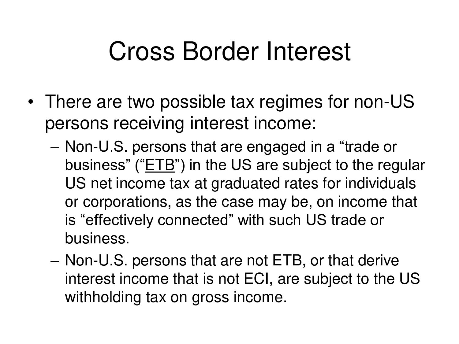 for non-US persons receiving interest income: – Non-U.S. persons that are engaged in a “trade or business” (“ETB”) in the US are subject to the regular US net income tax at graduated rates for individuals or corporations, as the case may be, on income that is “effectively connected” with such US trade or business. – Non-U.S. persons that are not ETB, or that derive interest income that is not ECI, are subject to the US withholding tax on gross income.