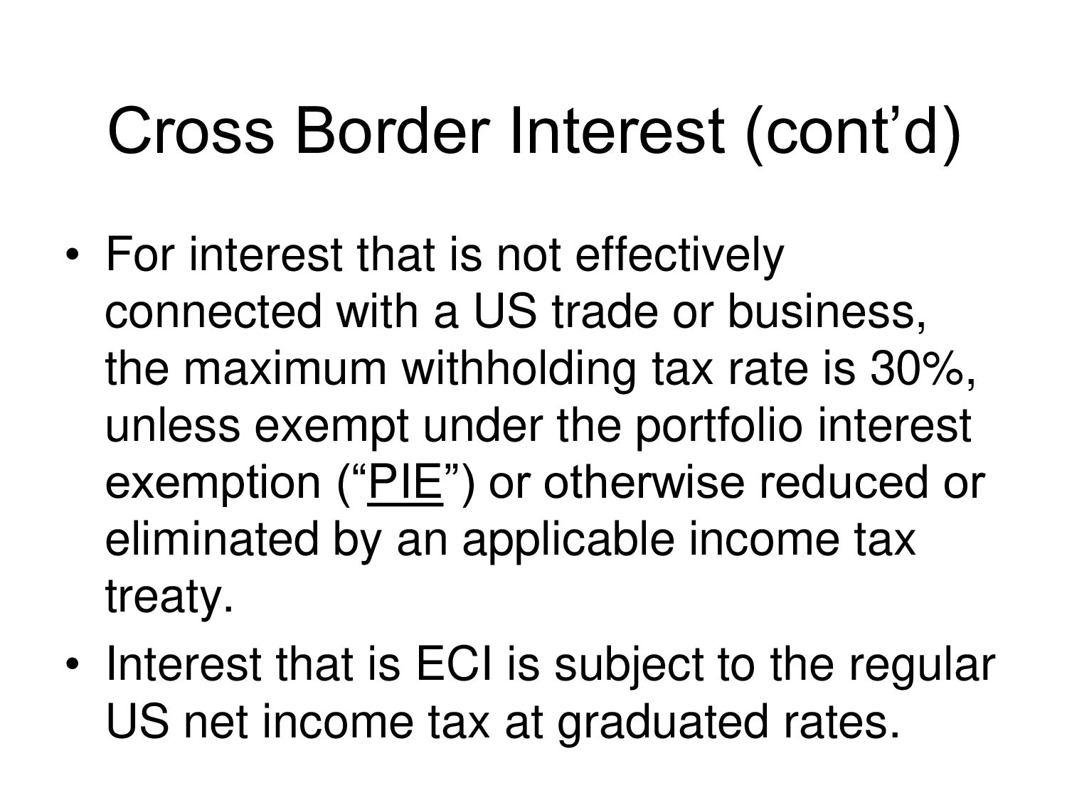 effectively connected with a US trade or business, the maximum withholding tax rate is 30%, unless exempt under the portfolio interest exemption (“PIE”) or otherwise reduced or eliminated by an applicable income tax treaty. • Interest that is ECI is subject to the regular US net income tax at graduated rates.