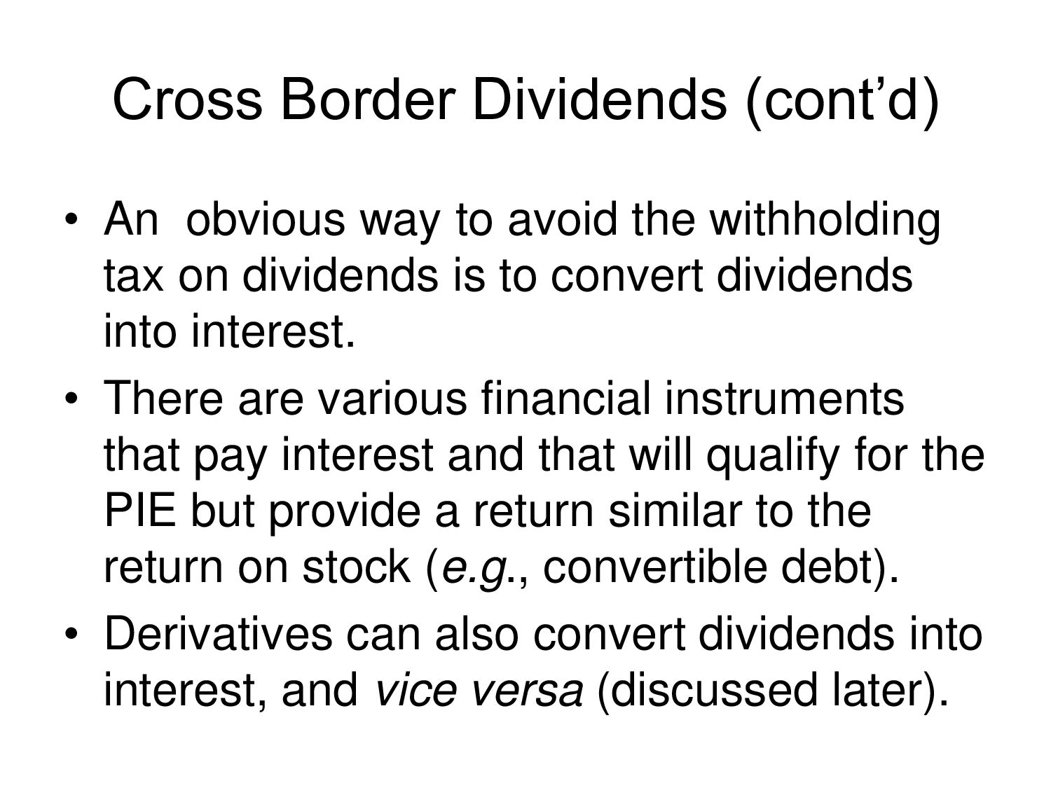 the withholding tax on dividends is to convert dividends into interest. • There are various financial instruments that pay interest and that will qualify for the PIE but provide a return similar to the return on stock (e.g., convertible debt). • Derivatives can also convert dividends into interest, and vice versa (discussed later).