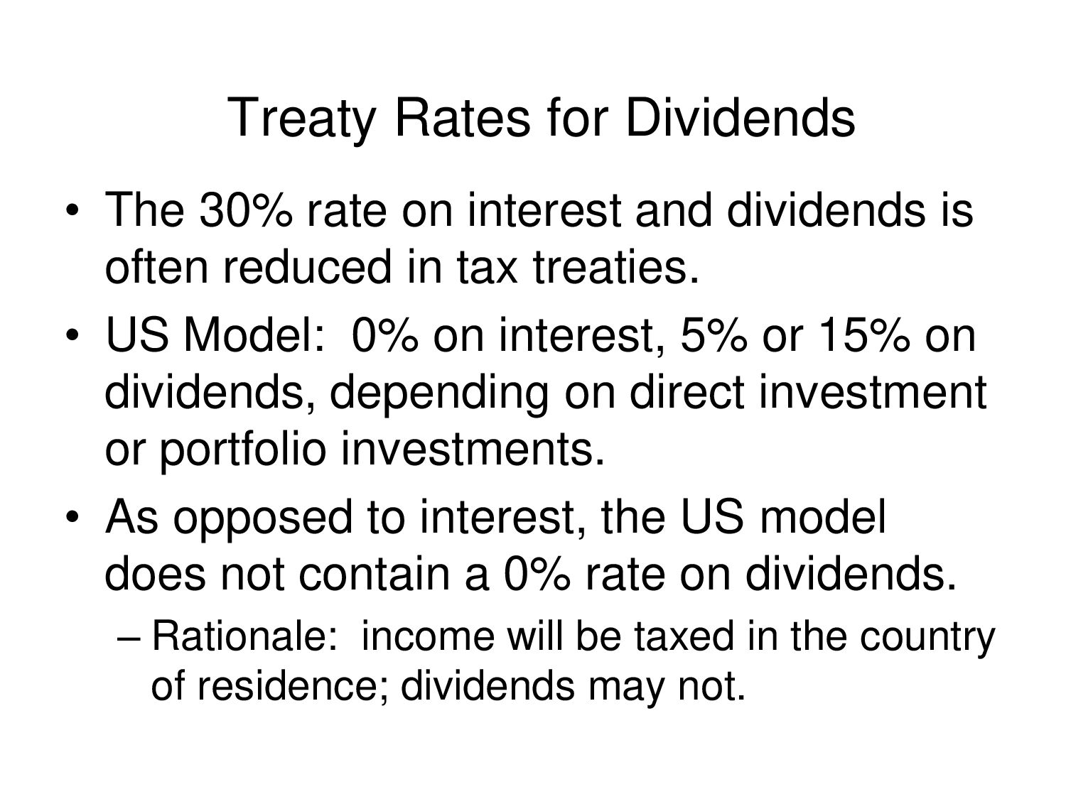 and dividends is often reduced in tax treaties. • US Model: 0% on interest, 5% or 15% on dividends, depending on direct investment or portfolio investments. • As opposed to interest, the US model does not contain a 0% rate on dividends. – Rationale: income will be taxed in the country of residence; dividends may not.