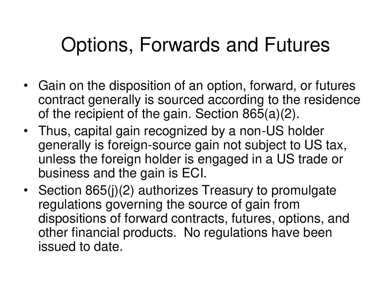 an option, forward, or futures contract generally is sourced according to the residence of the recipient of the gain. Section 865(a)(2). • Thus, capital gain recognized by a non-US holder generally is foreign-source gain not subject to US tax, unless the foreign holder is engaged in a US trade or business and the gain is ECI. • Section 865(j)(2) authorizes Treasury to promulgate regulations governing the source of gain from dispositions of forward contracts, futures, options, and other financial products. No regulations have been issued to date.