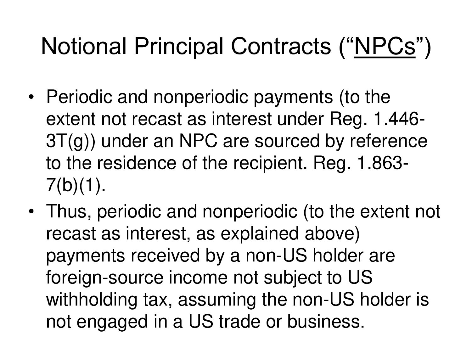 the extent not recast as interest under Reg. 1.446- 3T(g)) under an NPC are sourced by reference to the residence of the recipient. Reg. 1.863- 7(b)(1). • Thus, periodic and nonperiodic (to the extent not recast as interest, as explained above) payments received by a non-US holder are foreign-source income not subject to US withholding tax, assuming the non-US holder is not engaged in a US trade or business.