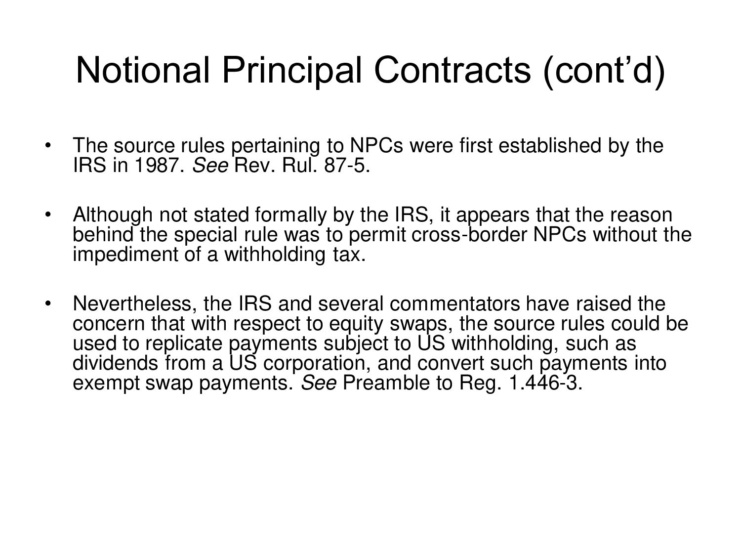 NPCs were first established by the IRS in 1987. See Rev. Rul. 87-5. • Although not stated formally by the IRS, it appears that the reason behind the special rule was to permit cross-border NPCs without the impediment of a withholding tax. • Nevertheless, the IRS and several commentators have raised the concern that with respect to equity swaps, the source rules could be used to replicate payments subject to US withholding, such as dividends from a US corporation, and convert such payments into exempt swap payments. See Preamble to Reg. 1.446-3.