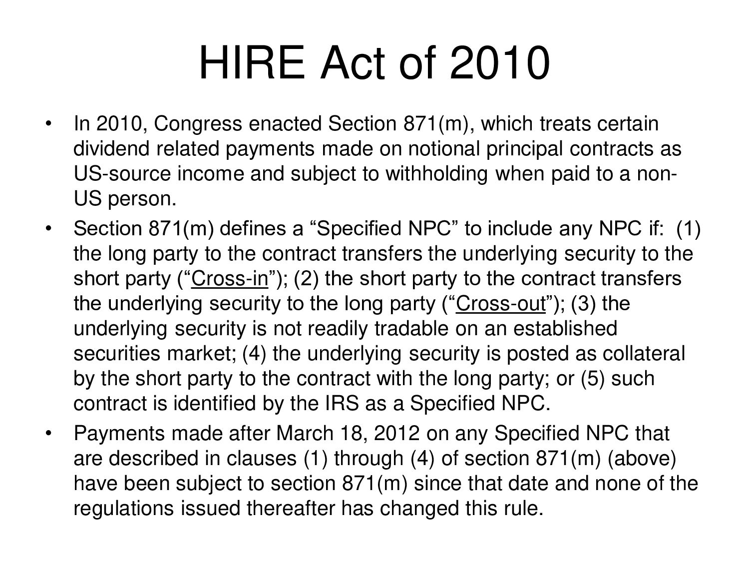 871(m), which treats certain dividend related payments made on notional principal contracts as US-source income and subject to withholding when paid to a non- US person. • Section 871(m) defines a “Specified NPC” to include any NPC if: (1) the long party to the contract transfers the underlying security to the short party (“Cross-in”); (2) the short party to the contract transfers the underlying security to the long party (“Cross-out”); (3) the underlying security is not readily tradable on an established securities market; (4) the underlying security is posted as collateral by the short party to the contract with the long party; or (5) such contract is identified by the IRS as a Specified NPC. • Payments made after March 18, 2012 on any Specified NPC that are described in clauses (1) through (4) of section 871(m) (above) have been subject to section 871(m) since that date and none of the regulations issued thereafter has changed this rule.