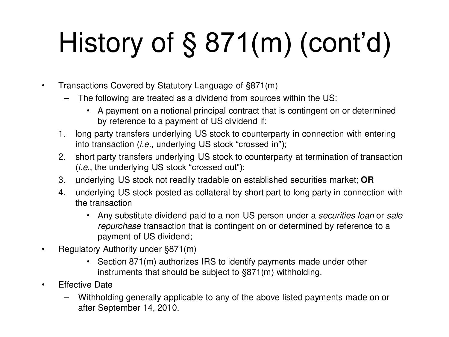 Language of §871(m) – The following are treated as a dividend from sources within the US: • A payment on a notional principal contract that is contingent on or determined by reference to a payment of US dividend if: 1. long party transfers underlying US stock to counterparty in connection with entering into transaction (i.e., underlying US stock “crossed in”); 2. short party transfers underlying US stock to counterparty at termination of transaction (i.e., the underlying US stock “crossed out”); 3. underlying US stock not readily tradable on established securities market; OR 4. underlying US stock posted as collateral by short part to long party in connection with the transaction • Any substitute dividend paid to a non-US person under a securities loan or sale- repurchase transaction that is contingent on or determined by reference to a payment of US dividend; • Regulatory Authority under §871(m) • Section 871(m) authorizes IRS to identify payments made under other instruments that should be subject to §871(m) withholding. • Effective Date – Withholding generally applicable to any of the above listed payments made on or after September 14, 2010.