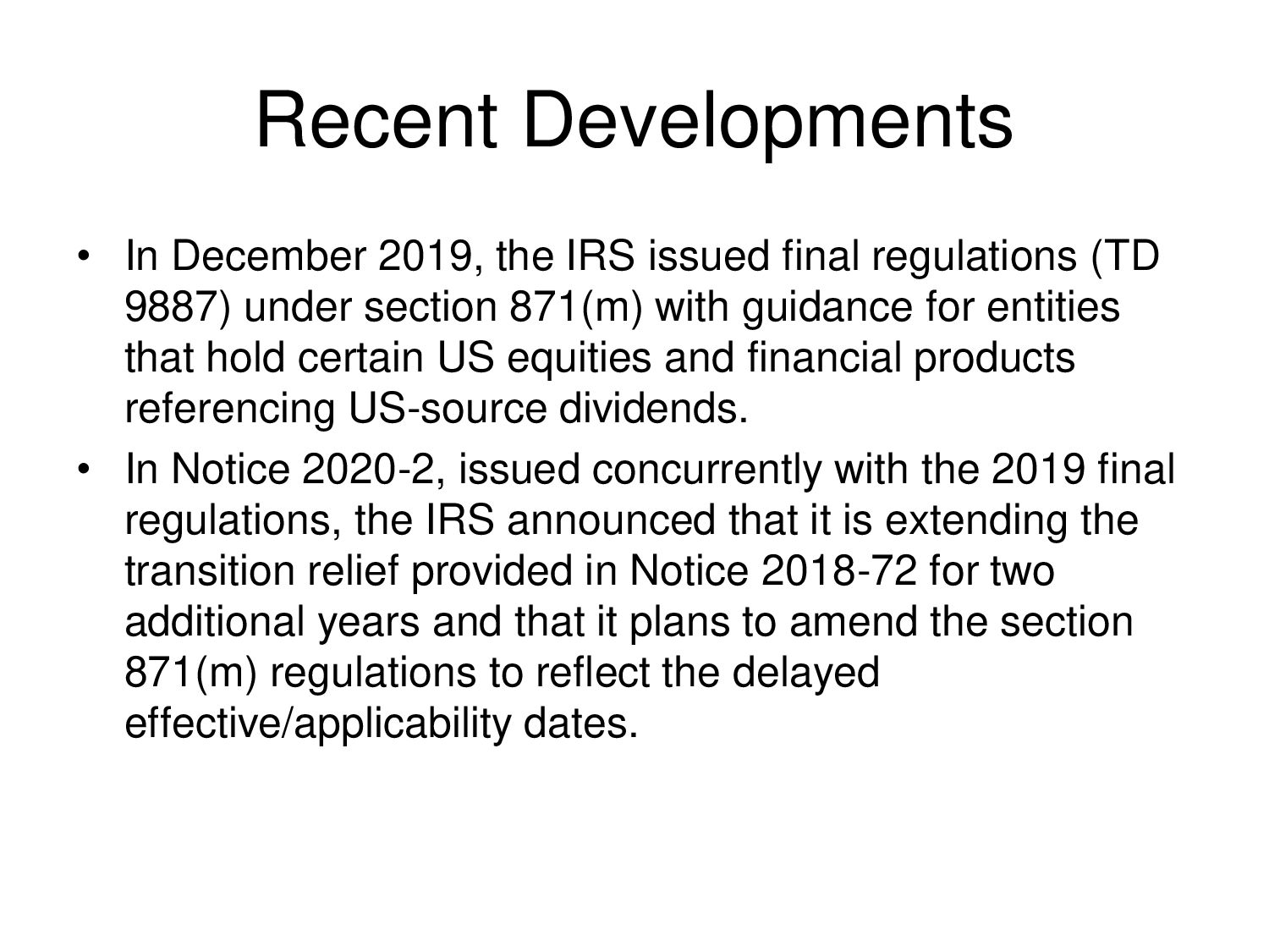 regulations (TD 9887) under section 871(m) with guidance for entities that hold certain US equities and financial products referencing US-source dividends. • In Notice 2020-2, issued concurrently with the 2019 final regulations, the IRS announced that it is extending the transition relief provided in Notice 2018-72 for two additional years and that it plans to amend the section 871(m) regulations to reflect the delayed effective/applicability dates.