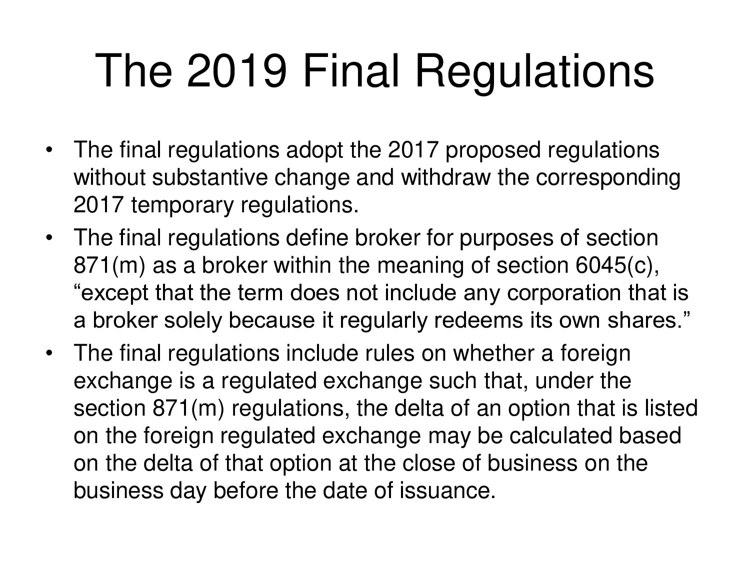 2017 proposed regulations without substantive change and withdraw the corresponding 2017 temporary regulations. • The final regulations define broker for purposes of section 871(m) as a broker within the meaning of section 6045(c), “except that the term does not include any corporation that is a broker solely because it regularly redeems its own shares.” • The final regulations include rules on whether a foreign exchange is a regulated exchange such that, under the section 871(m) regulations, the delta of an option that is listed on the foreign regulated exchange may be calculated based on the delta of that option at the close of business on the business day before the date of issuance.