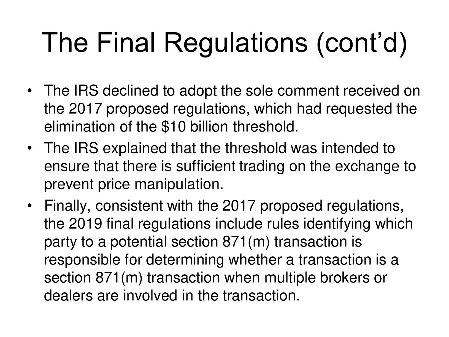 the sole comment received on the 2017 proposed regulations, which had requested the elimination of the $10 billion threshold. • The IRS explained that the threshold was intended to ensure that there is sufficient trading on the exchange to prevent price manipulation. • Finally, consistent with the 2017 proposed regulations, the 2019 final regulations include rules identifying which party to a potential section 871(m) transaction is responsible for determining whether a transaction is a section 871(m) transaction when multiple brokers or dealers are involved in the transaction.