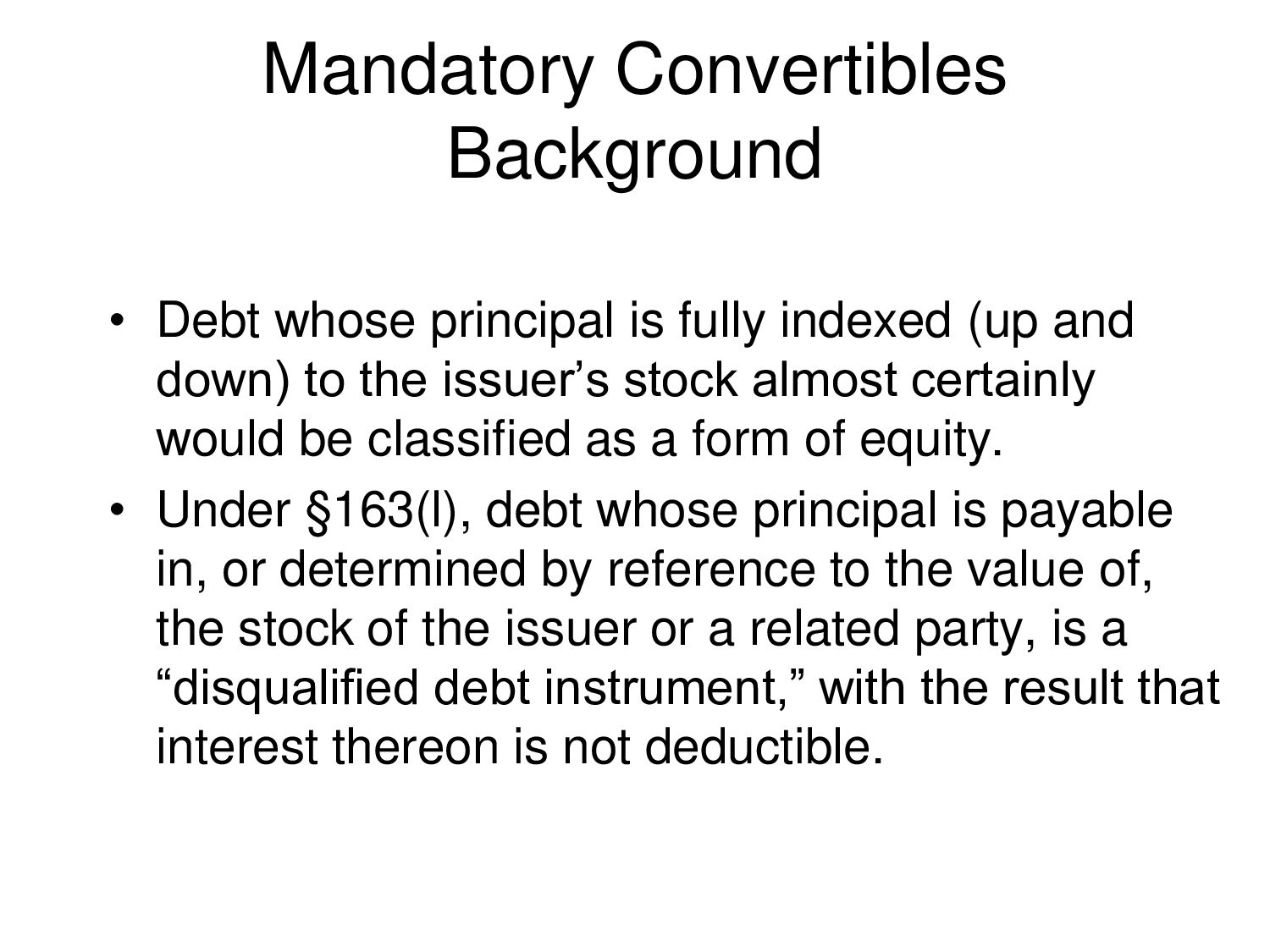 (up and down) to the issuer’s stock almost certainly would be classified as a form of equity. • Under §163(l), debt whose principal is payable in, or determined by reference to the value of, the stock of the issuer or a related party, is a “disqualified debt instrument,” with the result that interest thereon is not deductible.