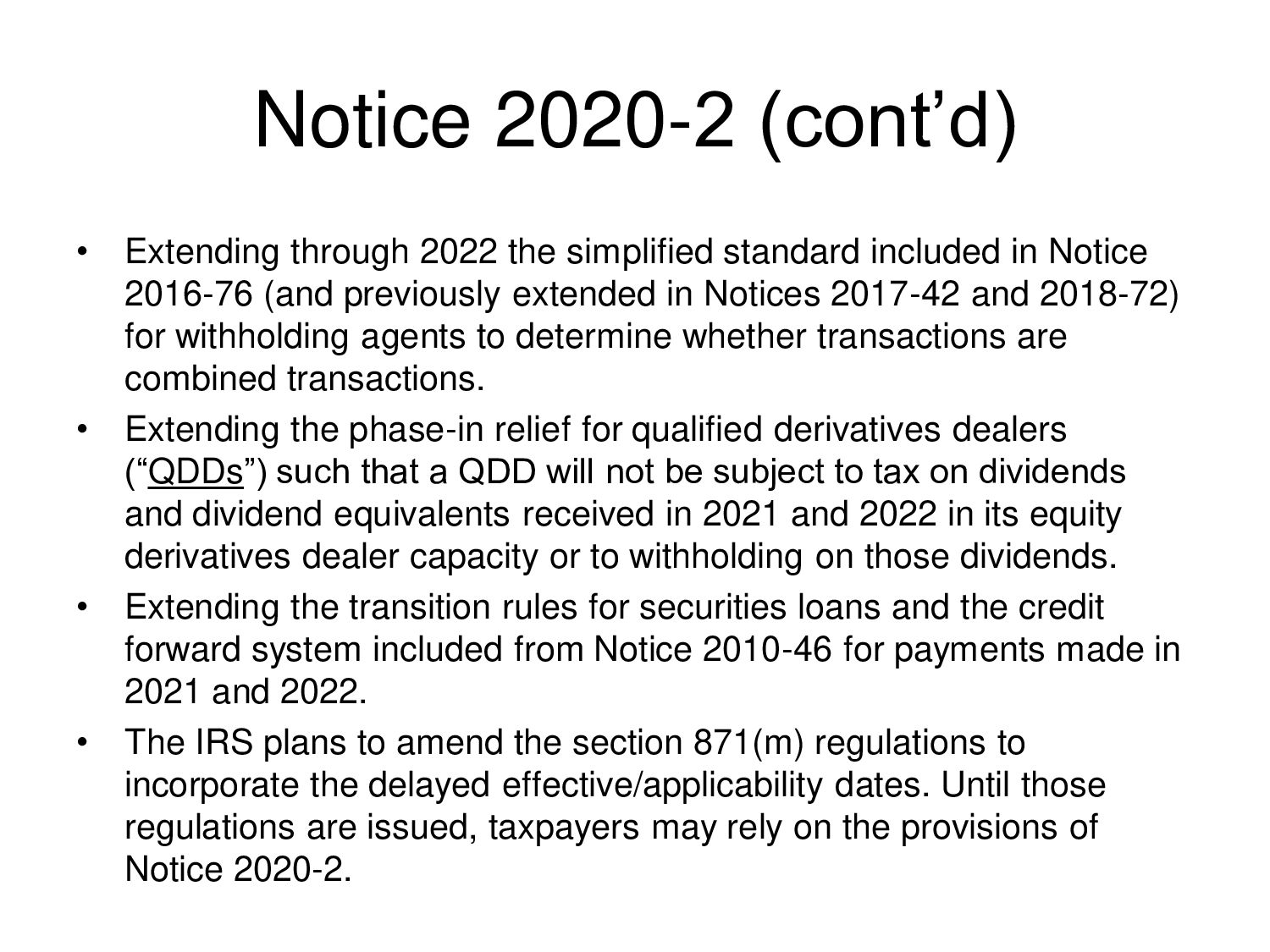 included in Notice 2016-76 (and previously extended in Notices 2017-42 and 2018-72) for withholding agents to determine whether transactions are combined transactions. • Extending the phase-in relief for qualified derivatives dealers (“QDDs”) such that a QDD will not be subject to tax on dividends and dividend equivalents received in 2021 and 2022 in its equity derivatives dealer capacity or to withholding on those dividends. • Extending the transition rules for securities loans and the credit forward system included from Notice 2010-46 for payments made in 2021 and 2022. • The IRS plans to amend the section 871(m) regulations to incorporate the delayed effective/applicability dates. Until those regulations are issued, taxpayers may rely on the provisions of Notice 2020-2.