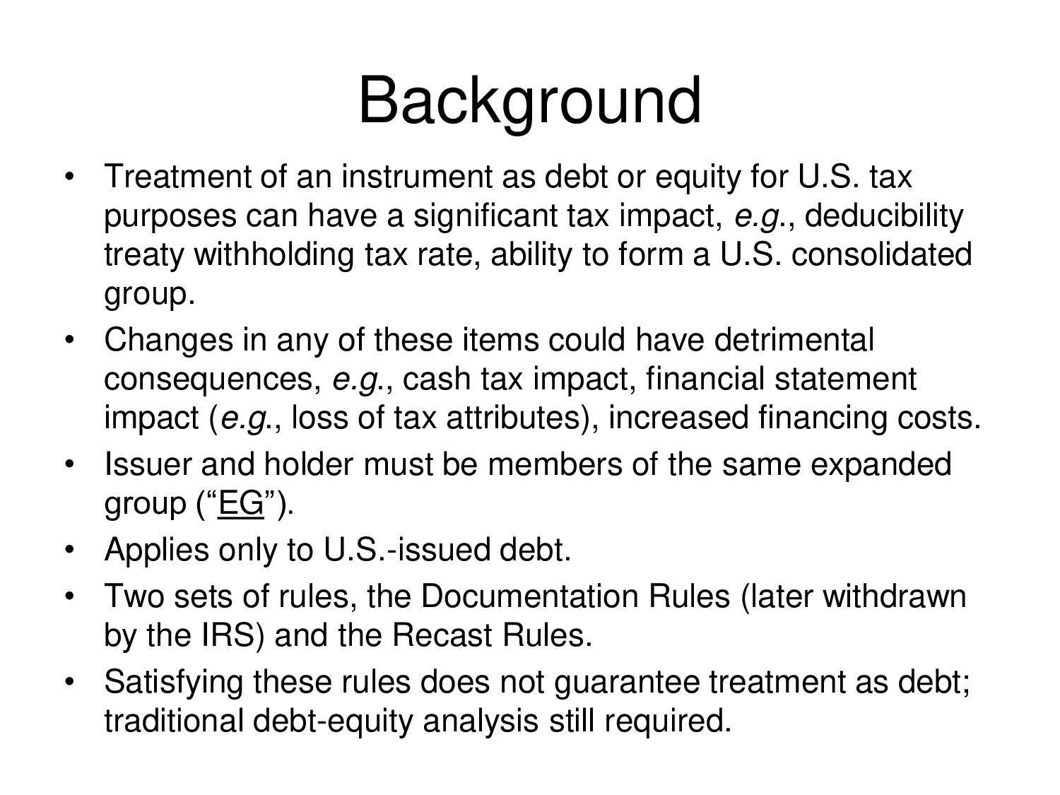 for U.S. tax purposes can have a significant tax impact, e.g., deducibility treaty withholding tax rate, ability to form a U.S. consolidated group. • Changes in any of these items could have detrimental consequences, e.g., cash tax impact, financial statement impact (e.g., loss of tax attributes), increased financing costs. • Issuer and holder must be members of the same expanded group (“EG”). • Applies only to U.S.-issued debt. • Two sets of rules, the Documentation Rules (later withdrawn by the IRS) and the Recast Rules. • Satisfying these rules does not guarantee treatment as debt; traditional debt-equity analysis still required.