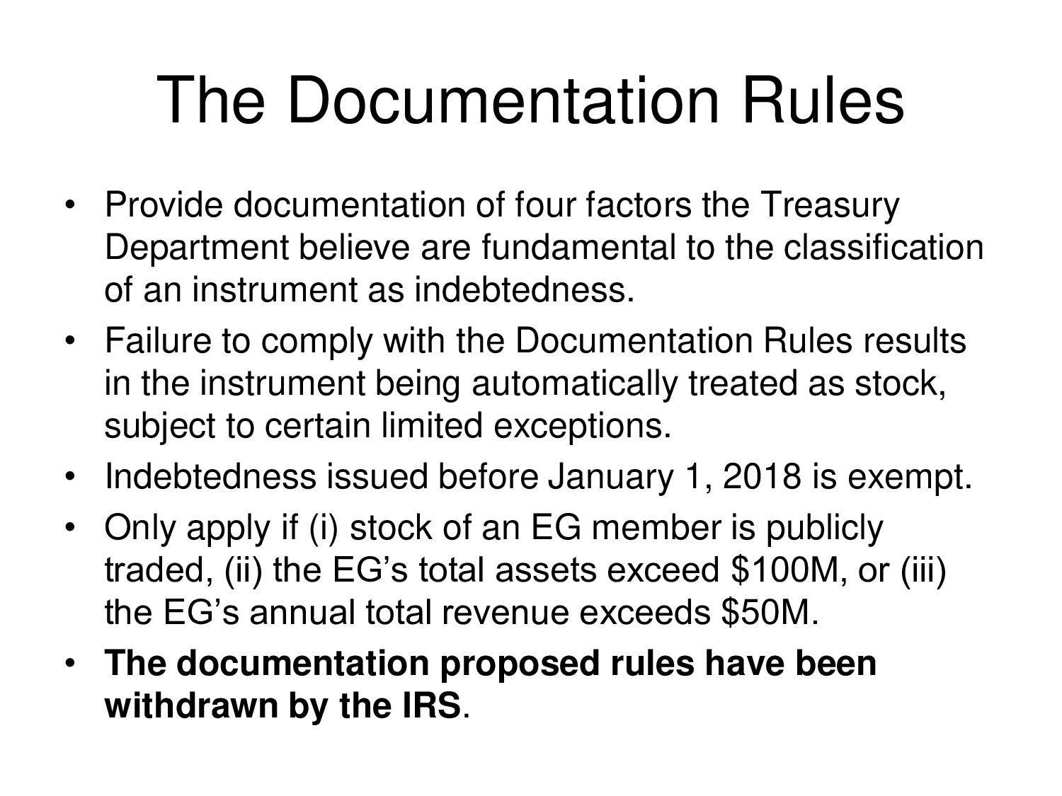 Treasury Department believe are fundamental to the classification of an instrument as indebtedness. • Failure to comply with the Documentation Rules results in the instrument being automatically treated as stock, subject to certain limited exceptions. • Indebtedness issued before January 1, 2018 is exempt. • Only apply if (i) stock of an EG member is publicly traded, (ii) the EG’s total assets exceed $100M, or (iii) the EG’s annual total revenue exceeds $50M. • The documentation proposed rules have been withdrawn by the IRS.