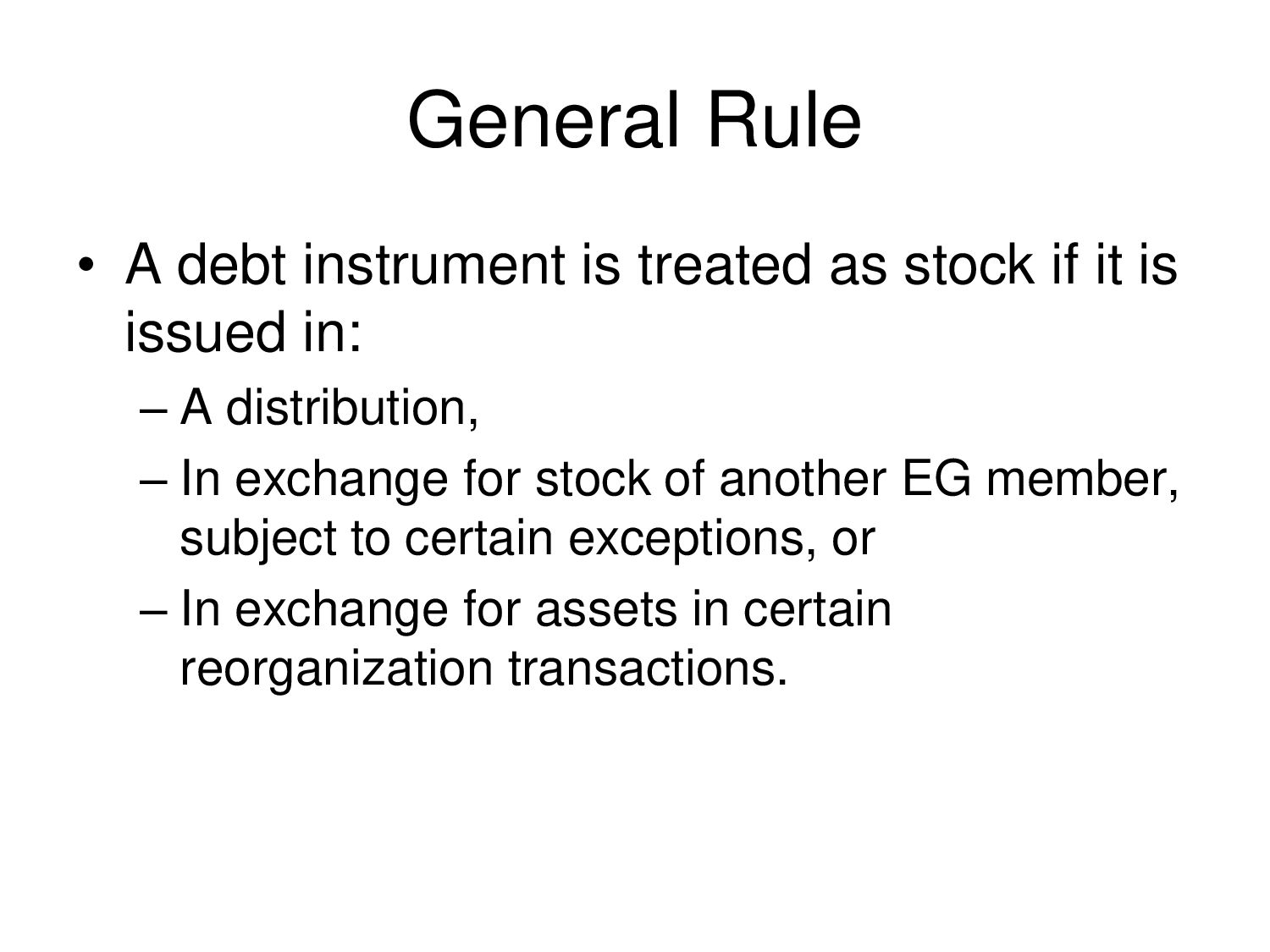if it is issued in: – A distribution, – In exchange for stock of another EG member, subject to certain exceptions, or – In exchange for assets in certain reorganization transactions.