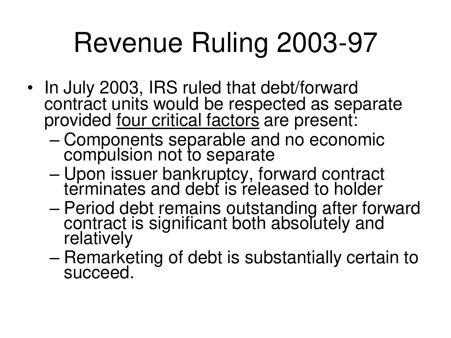 debt/forward contract units would be respected as separate provided four critical factors are present: – Components separable and no economic compulsion not to separate – Upon issuer bankruptcy, forward contract terminates and debt is released to holder – Period debt remains outstanding after forward contract is significant both absolutely and relatively – Remarketing of debt is substantially certain to succeed.