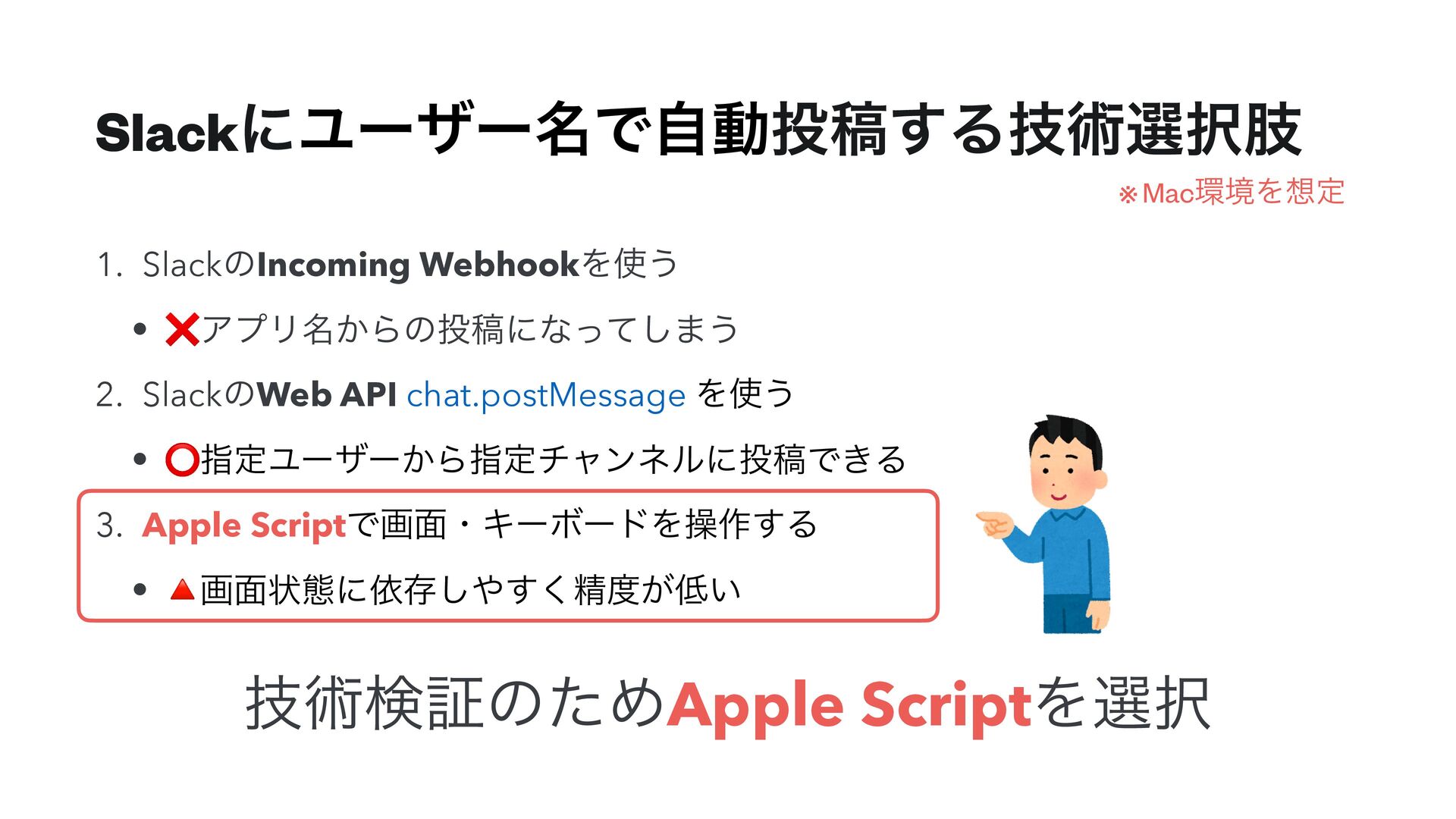 Λ͏ • ⭕ࢦఆϢʔβʔ͔ΒࢦఆνϟϯωϧʹߘͰ͖Δ 3. Apple ScriptͰը໘ɾΩʔϘʔυΛૢ࡞͢Δ • 🔺ը໘ঢ়ଶʹґଘ͘͢͠ਫ਼͕͍ ٕज़ݕূͷͨΊApple ScriptΛબ ※ MacڥΛఆ
