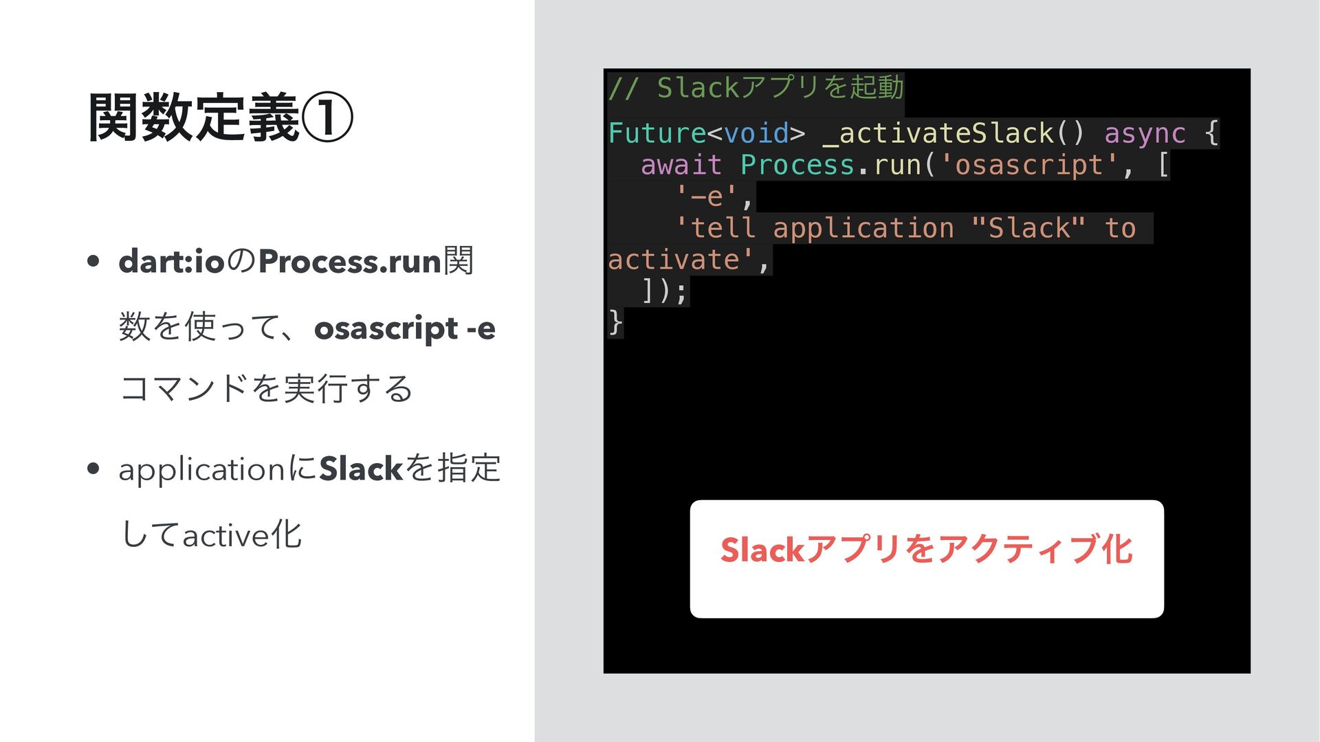 'tell application "Slack" to activate', ]); } • dart:ioͷProcess.runؔ Λͬͯɺosascript -e ίϚϯυΛ࣮ߦ͢Δ • applicationʹSlackΛࢦఆ ͯ͠activeԽ ؔఆٛᶃ SlackΞϓϦΛΞΫςΟϒԽ