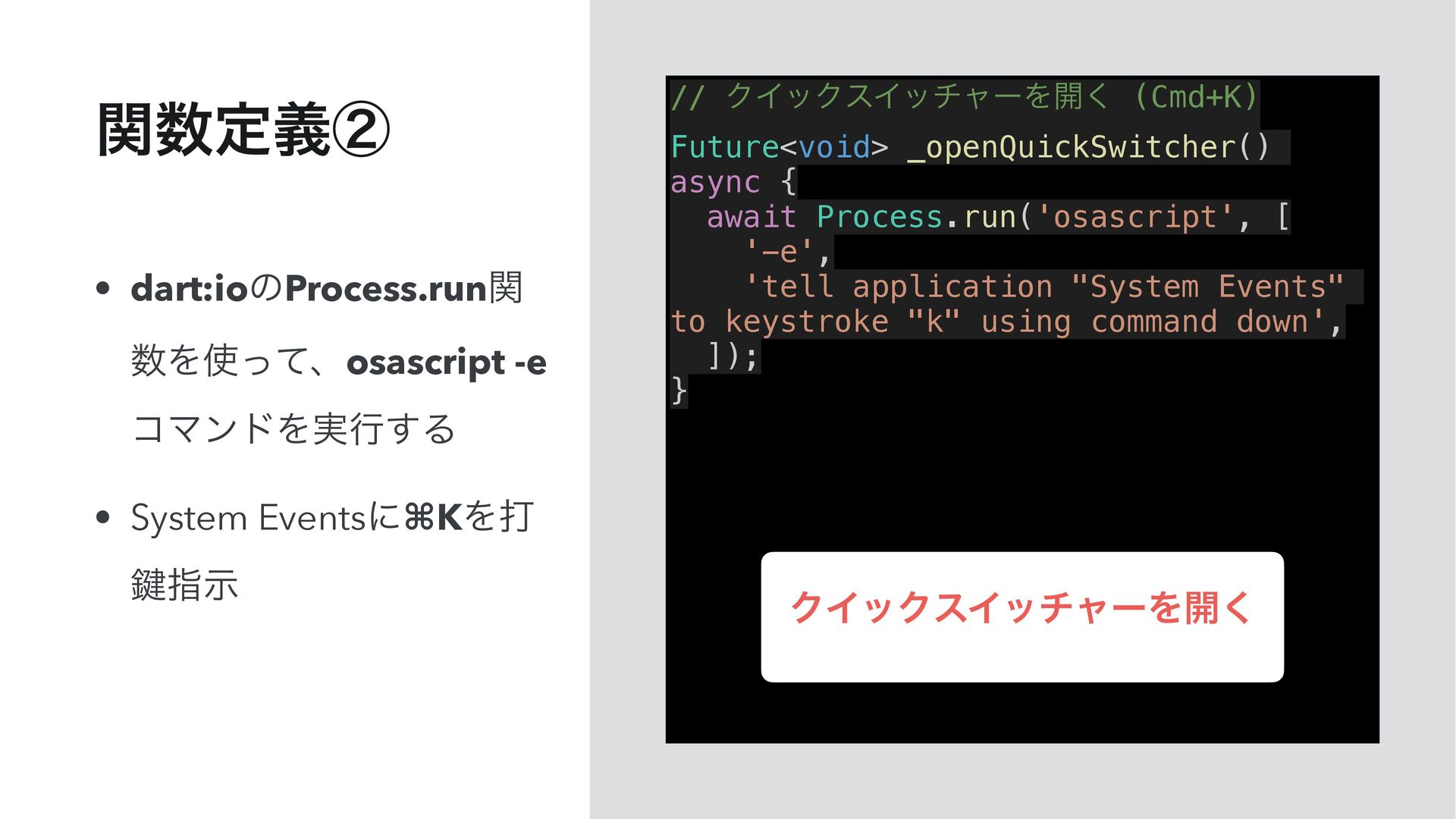 '-e', 'tell application "System Events" to keystroke "k" using command down', ]); } • dart:ioͷProcess.runؔ Λͬͯɺosascript -e ίϚϯυΛ࣮ߦ͢Δ • System Eventsʹ⌘KΛଧ 伴ࢦࣔ ؔఆٛᶄ ΫΠοΫεΠονϟʔΛ։͘