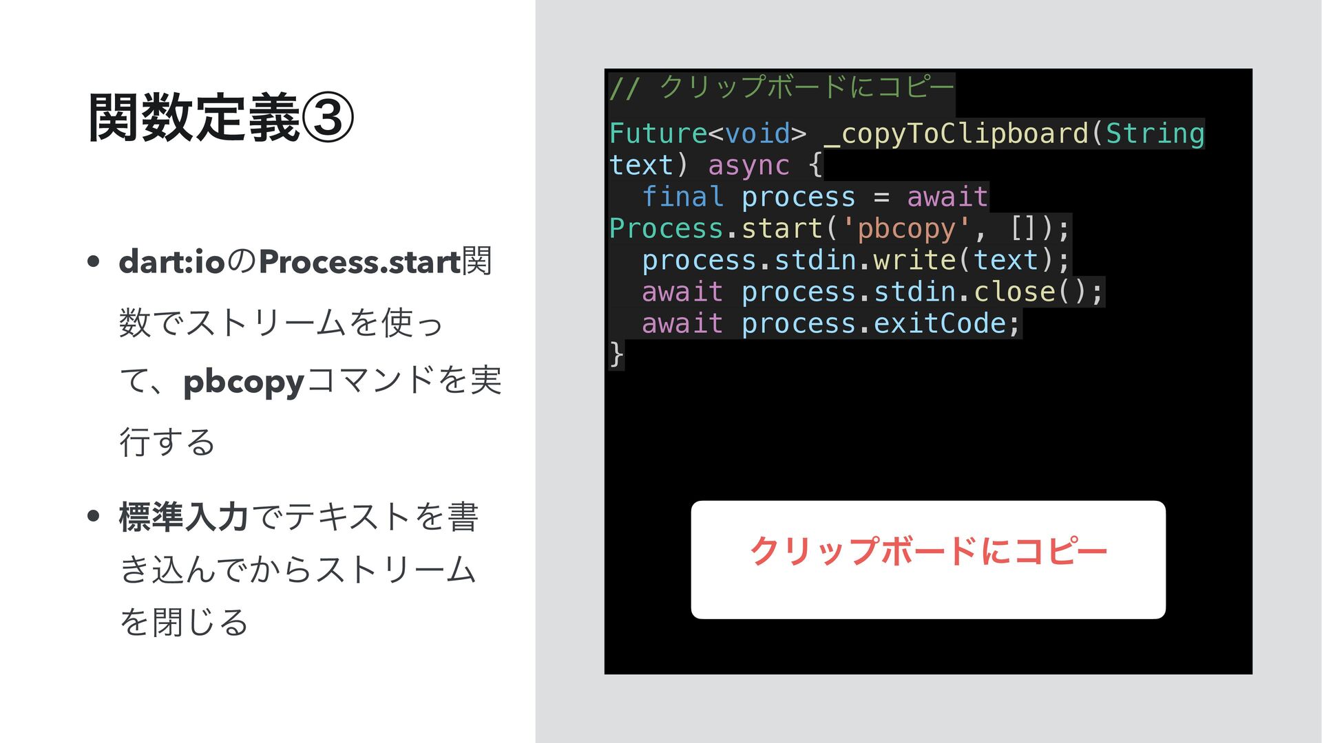 await Process.start('pbcopy', []); process.stdin.write(text); await process.stdin.close(); await process.exitCode; } • dart:ioͷProcess.startؔ ͰετϦʔϜΛͬ ͯɺpbcopyίϚϯυΛ࣮ ߦ͢Δ • ඪ४ೖྗͰςΩετΛॻ ͖ࠐΜͰ͔ΒετϦʔϜ Λด͡Δ ؔఆٛᶅ ΫϦοϓϘʔυʹίϐʔ