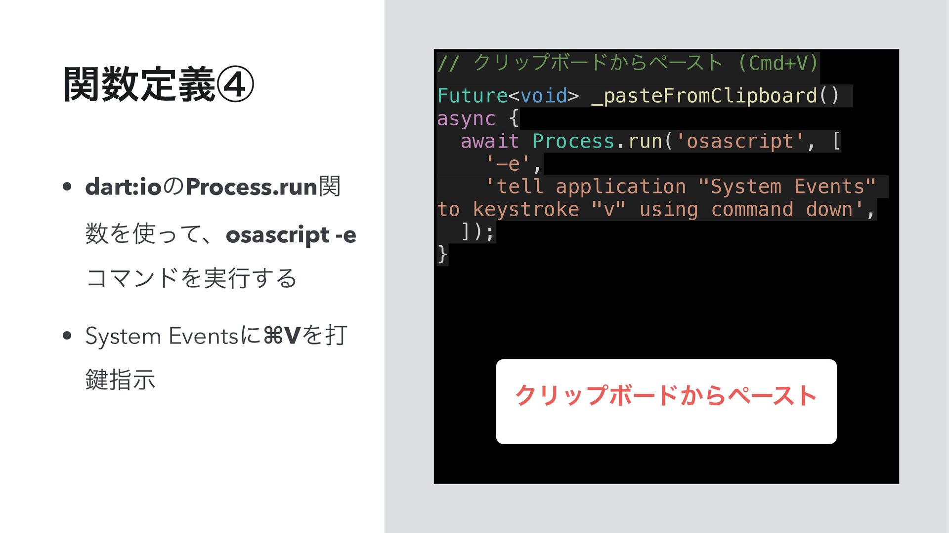 '-e', 'tell application "System Events" to keystroke "v" using command down', ]); } • dart:ioͷProcess.runؔ Λͬͯɺosascript -e ίϚϯυΛ࣮ߦ͢Δ • System Eventsʹ⌘VΛଧ 伴ࢦࣔ ؔఆٛᶆ ΫϦοϓϘʔυ͔Βϖʔετ