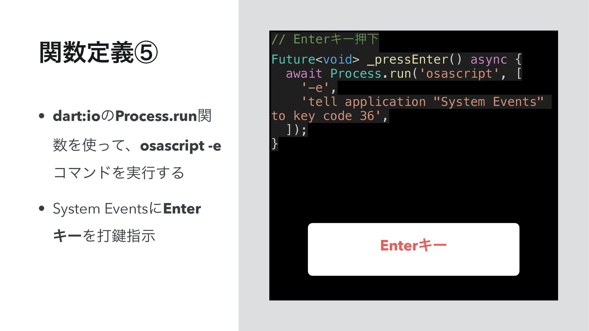 'tell application "System Events" to key code 36', ]); } • dart:ioͷProcess.runؔ Λͬͯɺosascript -e ίϚϯυΛ࣮ߦ͢Δ • System EventsʹEnter ΩʔΛଧ伴ࢦࣔ ؔఆٛᶇ EnterΩʔ