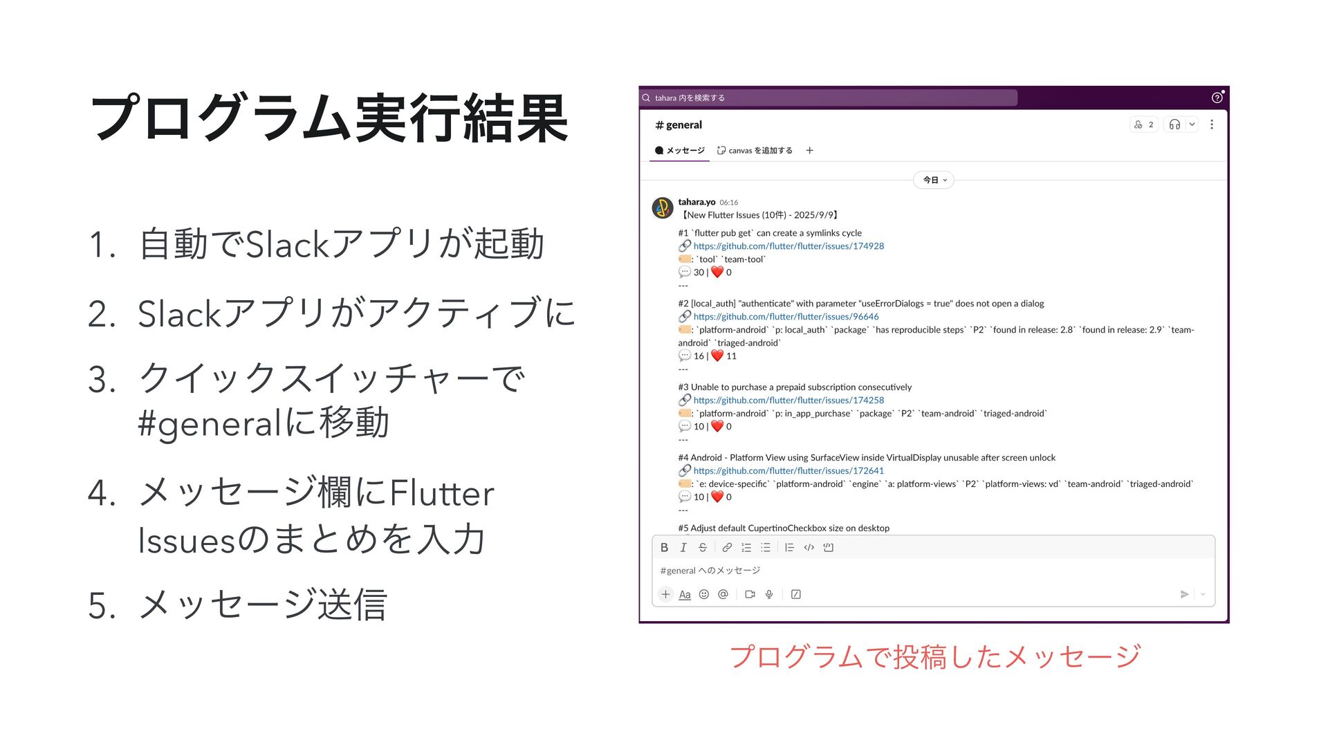 ϓϩάϥϜ࣮ߦ݁Ռ 1. ࣗಈͰSlackΞϓϦ͕ىಈ 2. SlackΞϓϦ͕ΞΫςΟϒʹ 3. ΫΠοΫεΠονϟʔͰ #generalʹҠಈ 4. ϝοηʔδཝʹFlutter