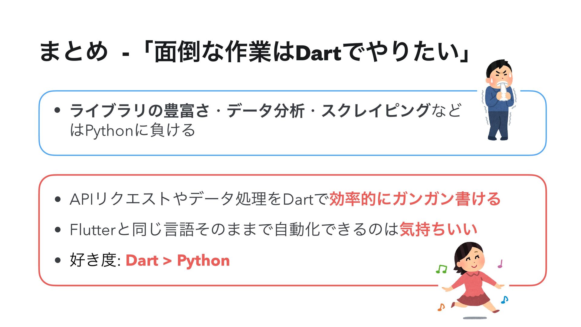 ·ͱΊ -ʮ໘ͳ࡞ۀDartͰΓ͍ͨʯ • ϥΠϒϥϦͷ๛͞ɾσʔλੳɾεΫϨΠϐϯάͳͲ Pythonʹෛ͚Δ • APIϦΫΤετσʔλॲཧΛDartͰޮతʹΨϯΨϯॻ͚Δ • Flutterͱಉ͡ݴޠͦͷ··ͰࣗಈԽͰ͖Δͷؾ͍͍࣋ͪ •