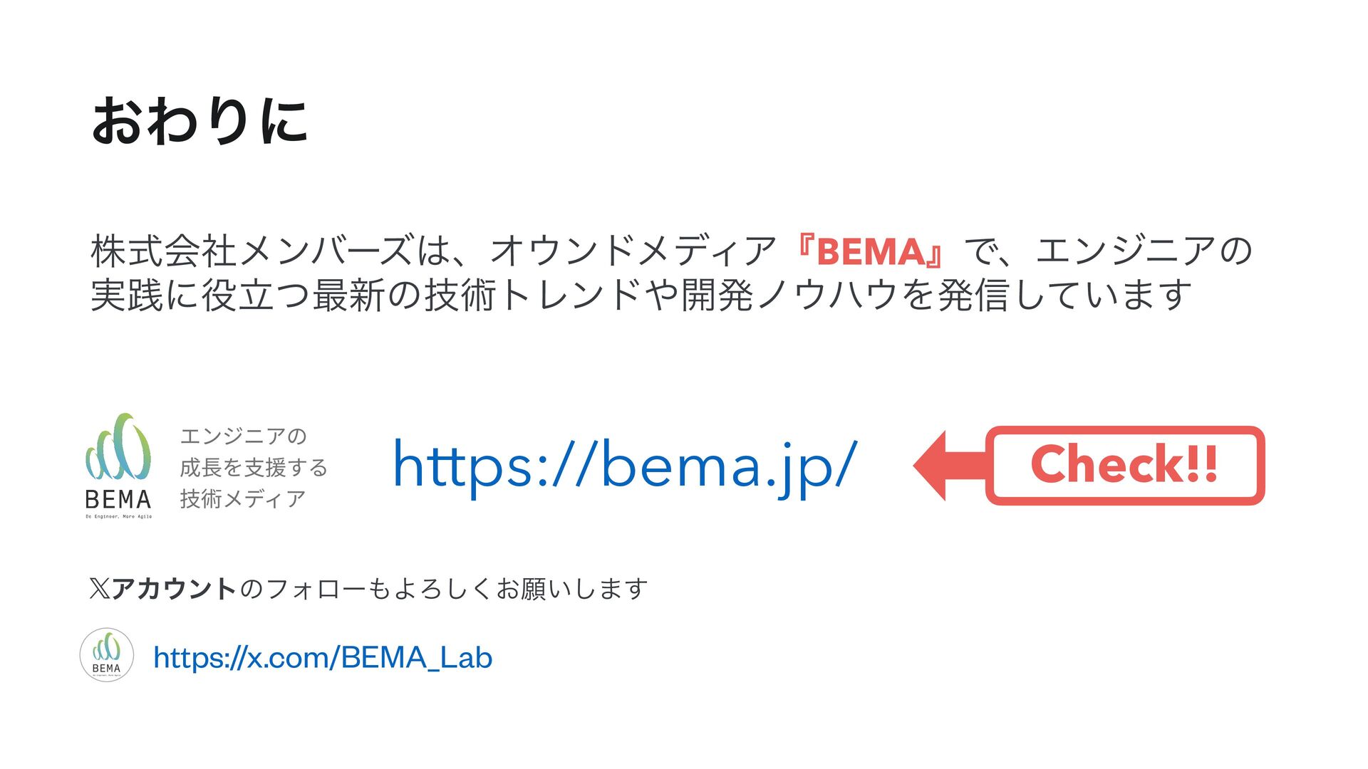 ͓ΘΓʹ גࣜձࣾϝϯόʔζɺΦϯυϝσΟΞʰBEMAʱͰɺΤϯδχΞͷ ࣮ફʹཱͭ࠷৽ͷٕज़τϨϯυ։ൃϊϋΛൃ৴͍ͯ͠·͢ https://bema.jp/ Check!! 𝕏 ΞΧϯτͷϑΥϩʔΑΖ͓͘͠ئ͍͠·͢ https://x.com/BEMA_Lab エンジニアの 成