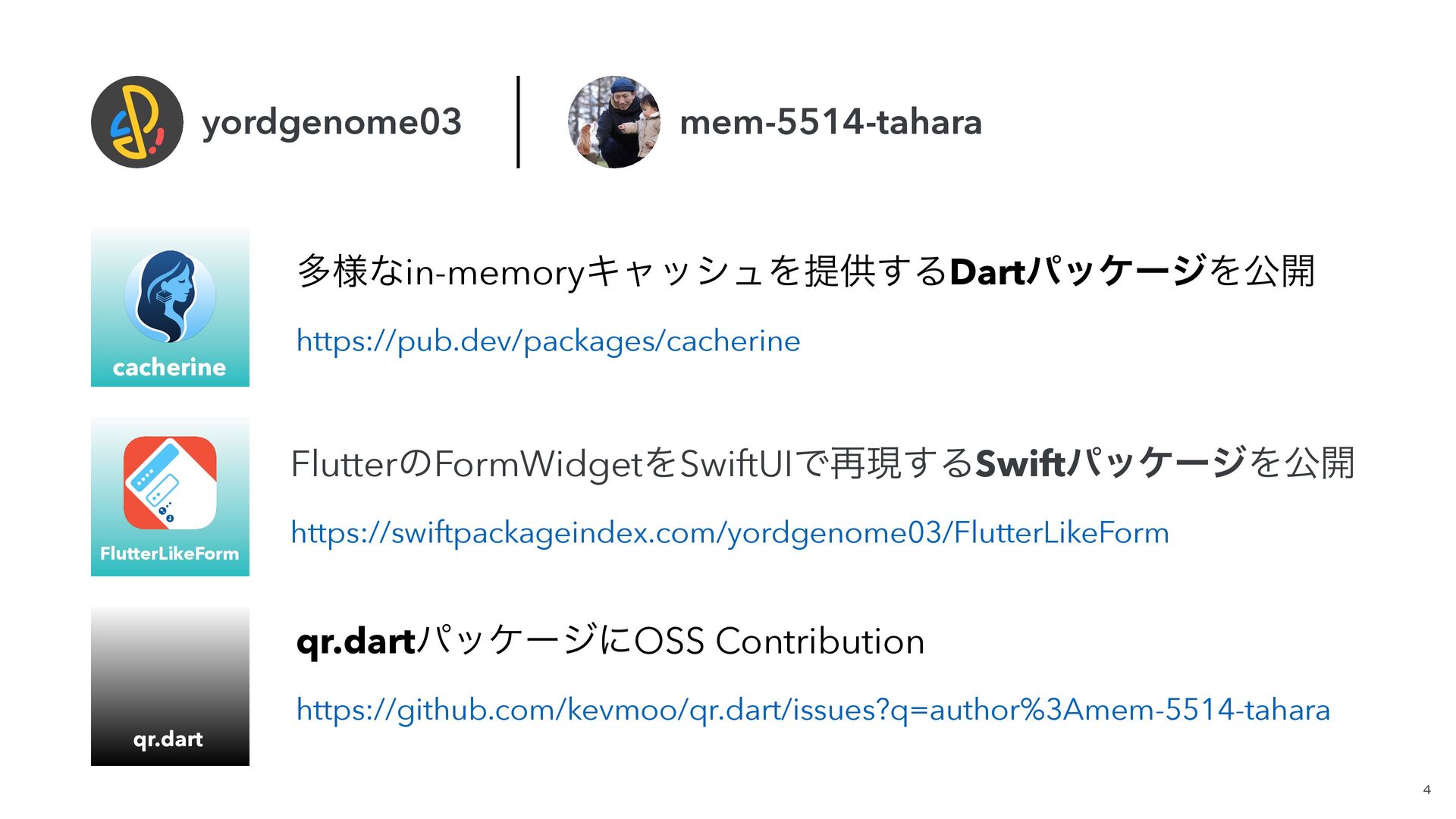 ଟ༷ͳin-memoryΩϟογϡΛఏڙ͢ΔDartύοέʔδΛެ։ https://pub.dev/packages/cacherine 4 yordgenome03 mem-5514-tahara qr.dartύοέʔδʹOSS Contribution https://github.com/kevmoo/qr.dart/issues?q=author%3Amem-5514-tahara FlutterͷFormWidgetΛSwiftUIͰ࠶ݱ͢ΔSwiftύοέʔδΛެ։ https://swiftpackageindex.com/yordgenome03/FlutterLikeForm