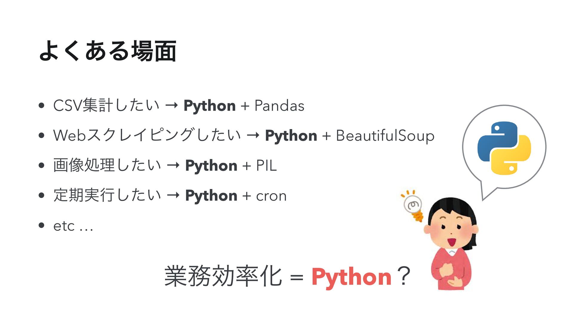 Python + BeautifulSoup • ը૾ॲཧ͍ͨ͠ → Python + PIL • ఆظ࣮ߦ͍ͨ͠ → Python + cron • etc … ۀޮԽ = Pythonʁ