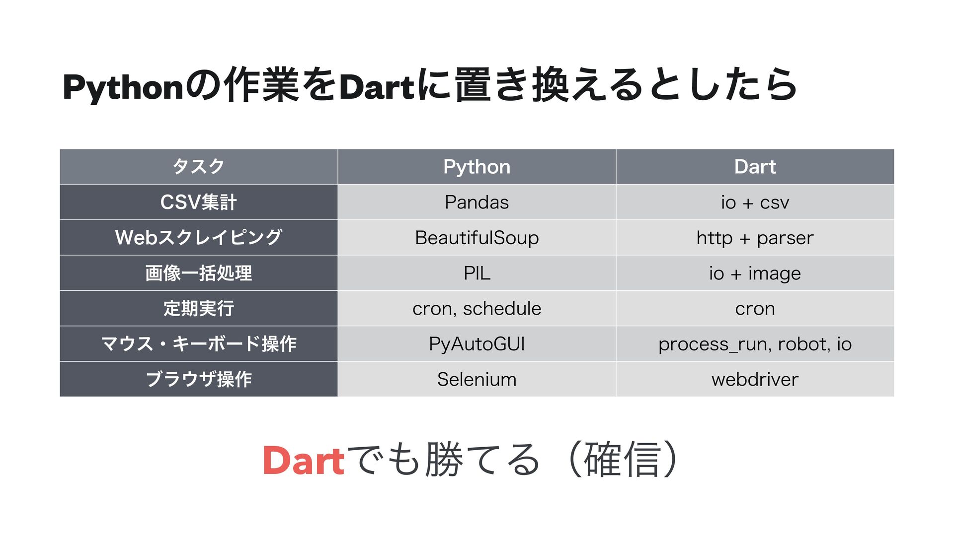 Pythonͷ࡞ۀΛDartʹஔ͖͑Δͱͨ͠Β DartͰউͯΔʢ֬৴ʣ λεΫ 1ZUIPO %BSU $47ूܭ 1BOEBT JP DTW 8FCεΫϨΠϐϯά