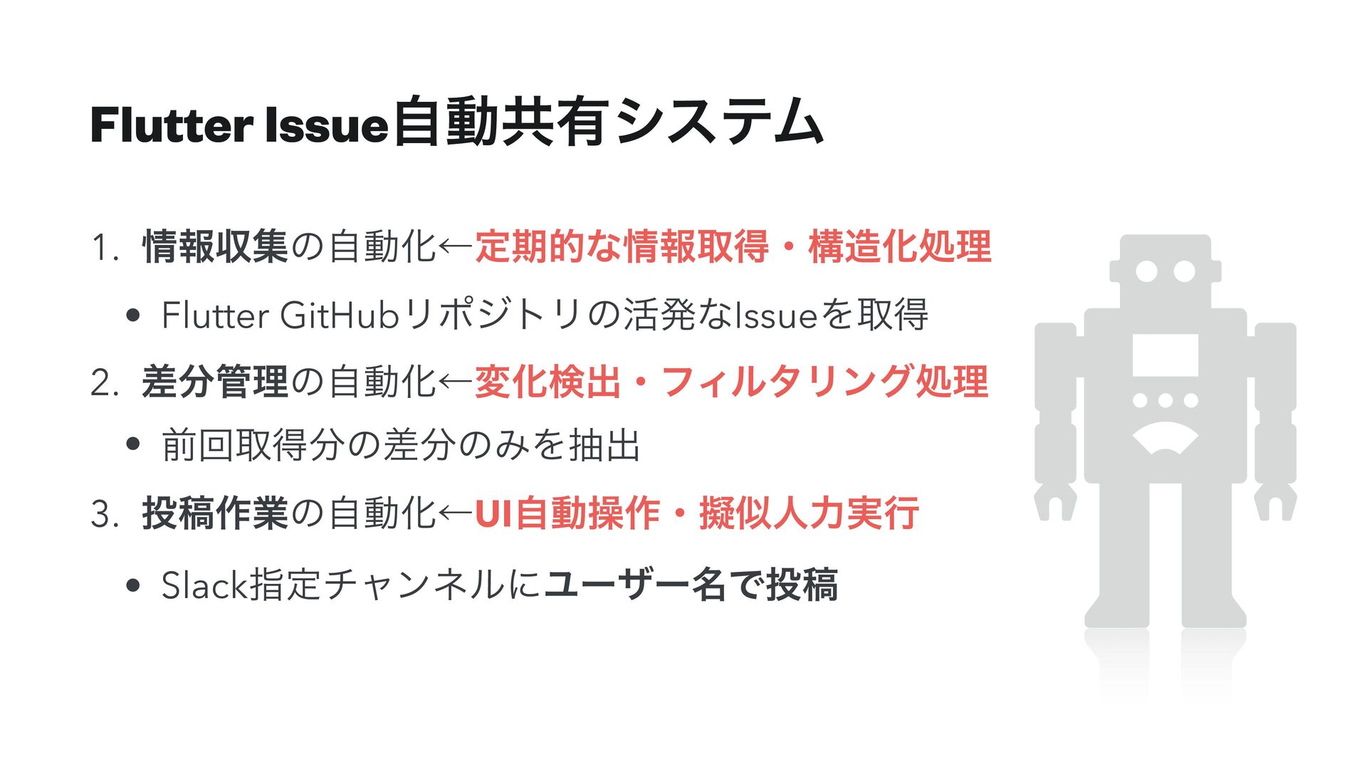 Flutter Issueࣗಈڞ༗γεςϜ 1. ใऩूͷࣗಈԽˡఆظతͳใऔಘɾߏԽॲཧ • Flutter GitHubϦϙδτϦͷ׆ൃͳIssueΛऔಘ 2. ࠩཧͷࣗಈԽˡมԽݕग़ɾϑΟϧλϦϯάॲཧ •