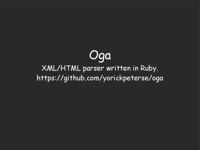Oga XML/HTML parser written in Ruby. https://github.com/yorickpeterse/oga