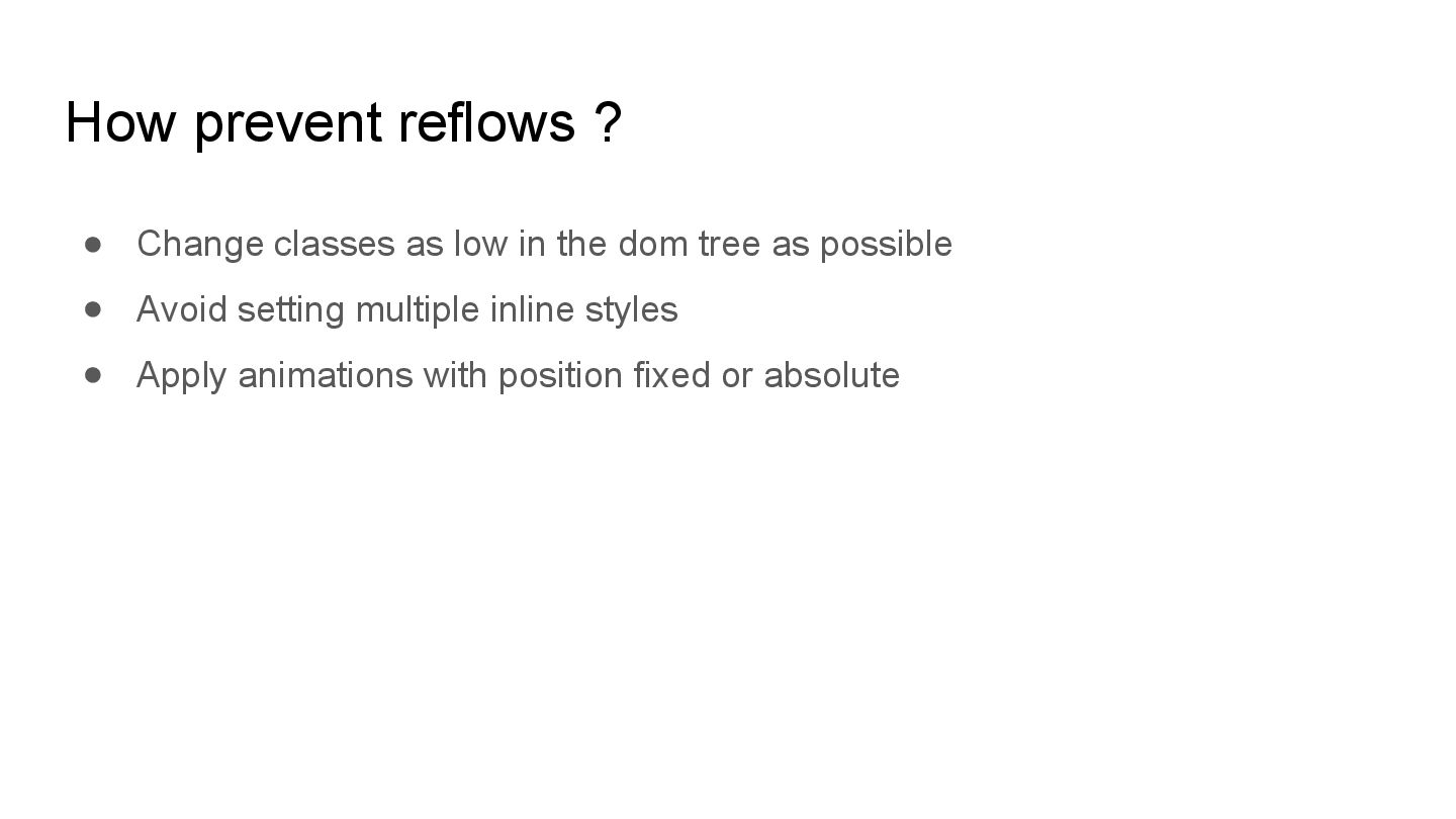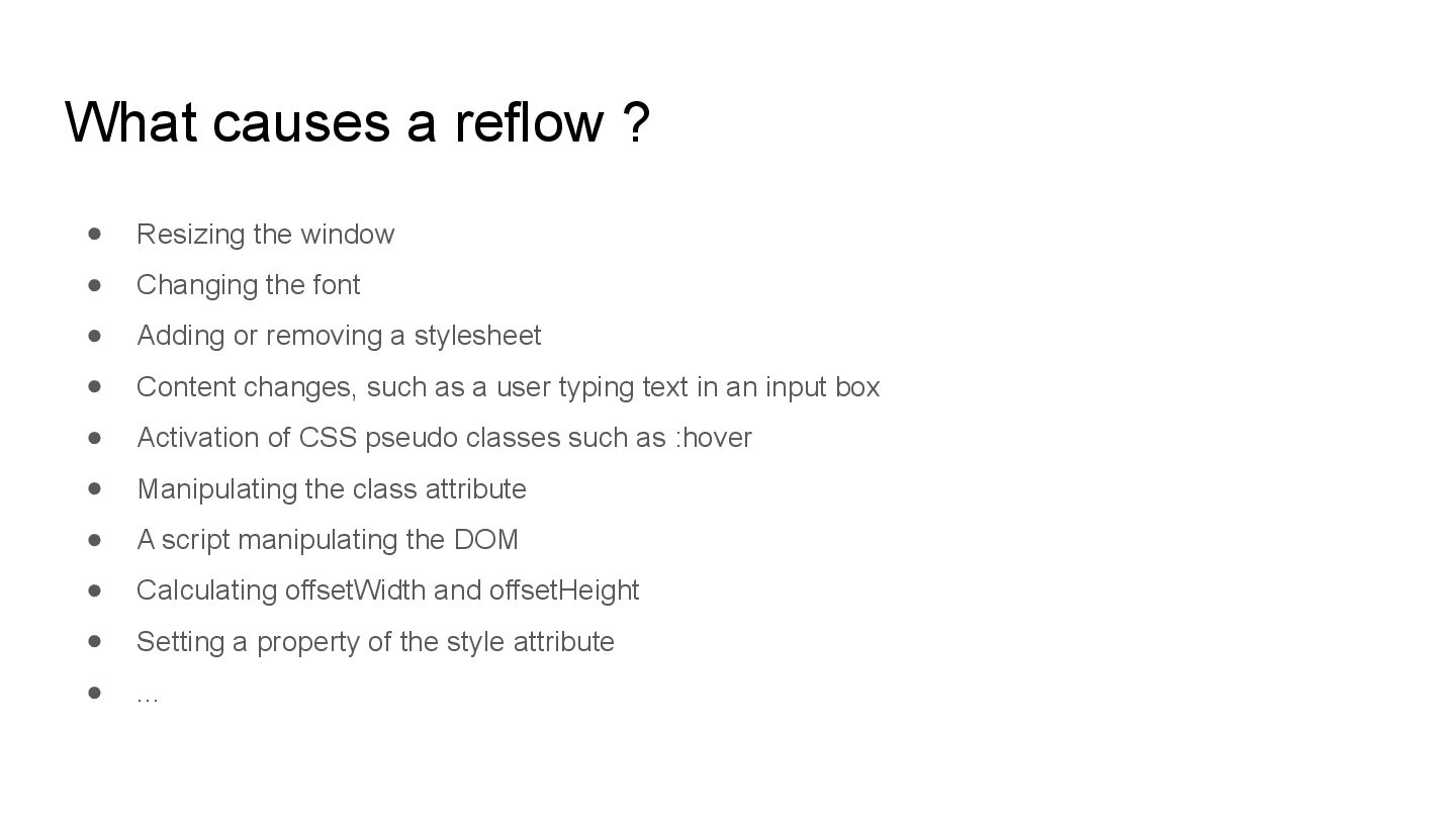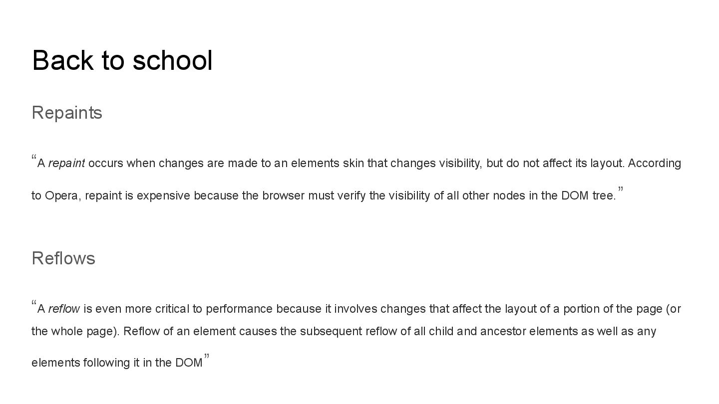 made to an elements skin that changes visibility, but do not affect its layout. According to Opera, repaint is expensive because the browser must verify the visibility of all other nodes in the DOM tree.” Reflows “A reflow is even more critical to performance because it involves changes that affect the layout of a portion of the page (or the whole page). Reflow of an element causes the subsequent reflow of all child and ancestor elements as well as any elements following it in the DOM”