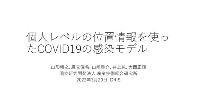 個⼈レベルの位置情報を使っ たCOVID19の感染モデル ⼭形賴之, 鷹⾒俊希, ⼭崎啓介, 井上純, ⼤⻄正輝 国⽴研究開発法⼈ 産業技術総合研究所 2022年3⽉29⽇,
