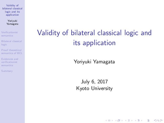 Verificationist semantics Bilateral classical logic Proof theoretical semantics of BCL Evidences and verificationist semantics Summary Validity A closed derivation π is valid in BCL(S) if π always reduces an evidence in BCL(S) π : a derivation with assumptions α1 , . . . , αn is valid in BCL(S) if ∀S ⊇ S, ∀valid closed derivations σ1 , . . . , σn in BCL(S ), π[σ1 /α1 , . . . , σn /αn ] is valid in BCL(S )