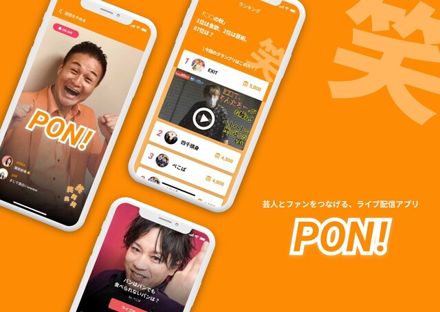芸人とファンの距離を近づけるライブ配信アプリ「PON!」 お題ごとに芸人たちが本気バトルができる配信アプリ。 視聴者が面白いと思ったら、「笑」ボタンを押し、一定数の「笑」が溜まるとPON!に。PON!の数で評価されるランキング制度があり、毎月のモチベーションに繋がります。 それぞれの配信はアーカイブ化されるので、いつでもどこでも好きな配信を見ることができ、視聴者にも嬉しいアプリです。