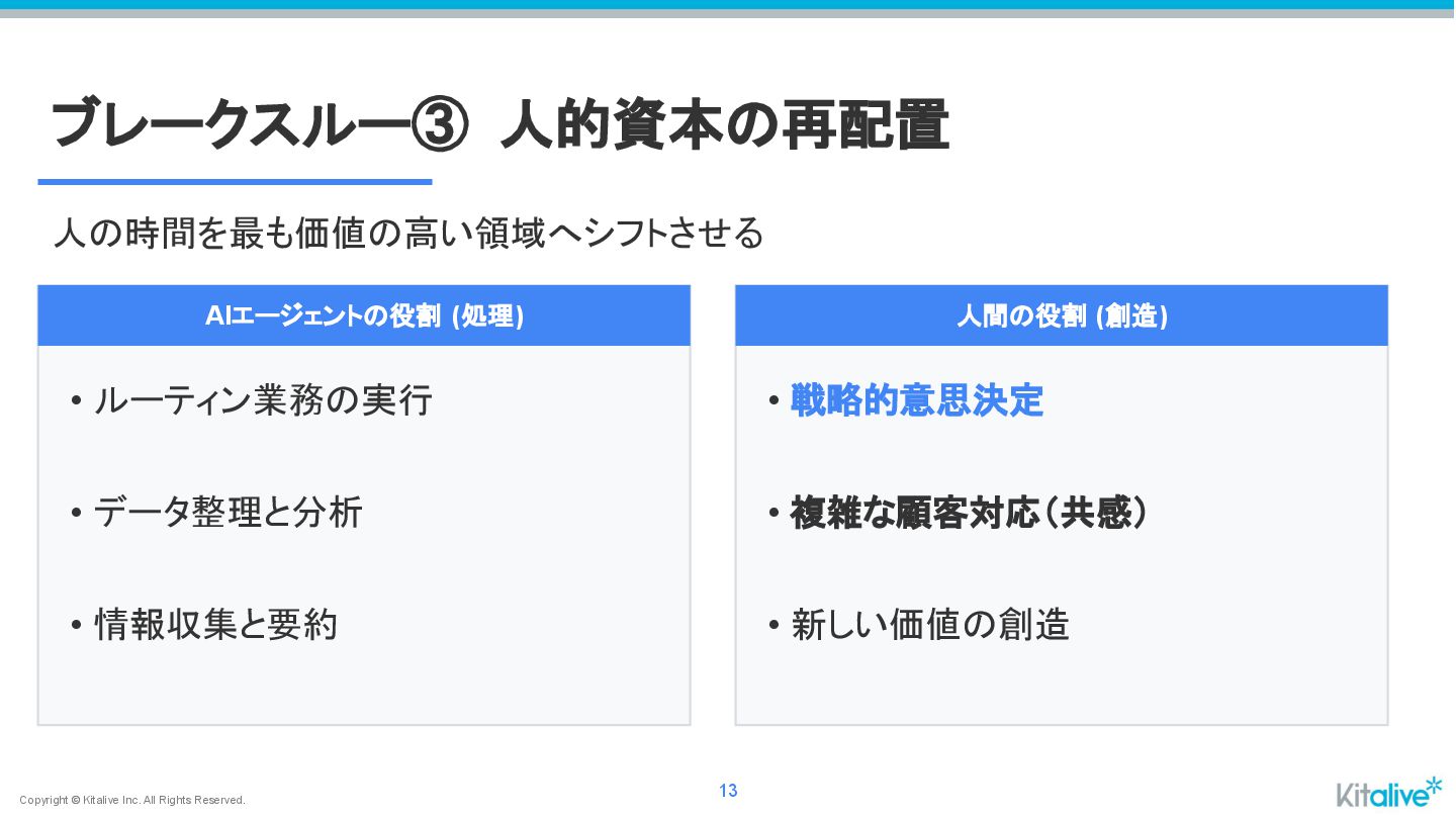 Copyright © Kitalive Inc. All Rights Reserved. ブレークスルー③ 人的資本の再配置 人の時間を最も価値の高い領域へシフトさせる