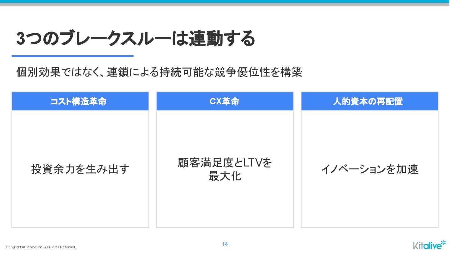 Copyright © Kitalive Inc. All Rights Reserved. 3つのブレークスルーは連動する 個別効果ではなく、連鎖による持続可能な競争優位性を構築 コスト構造革命