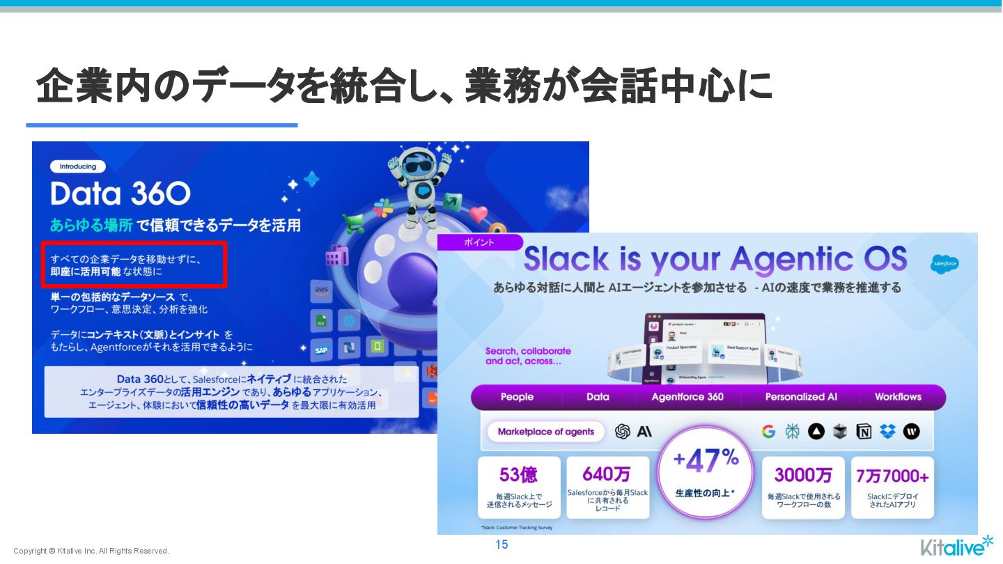 Copyright © Kitalive Inc. All Rights Reserved. 企業内のデータを統合し、業務が会話中心に 15