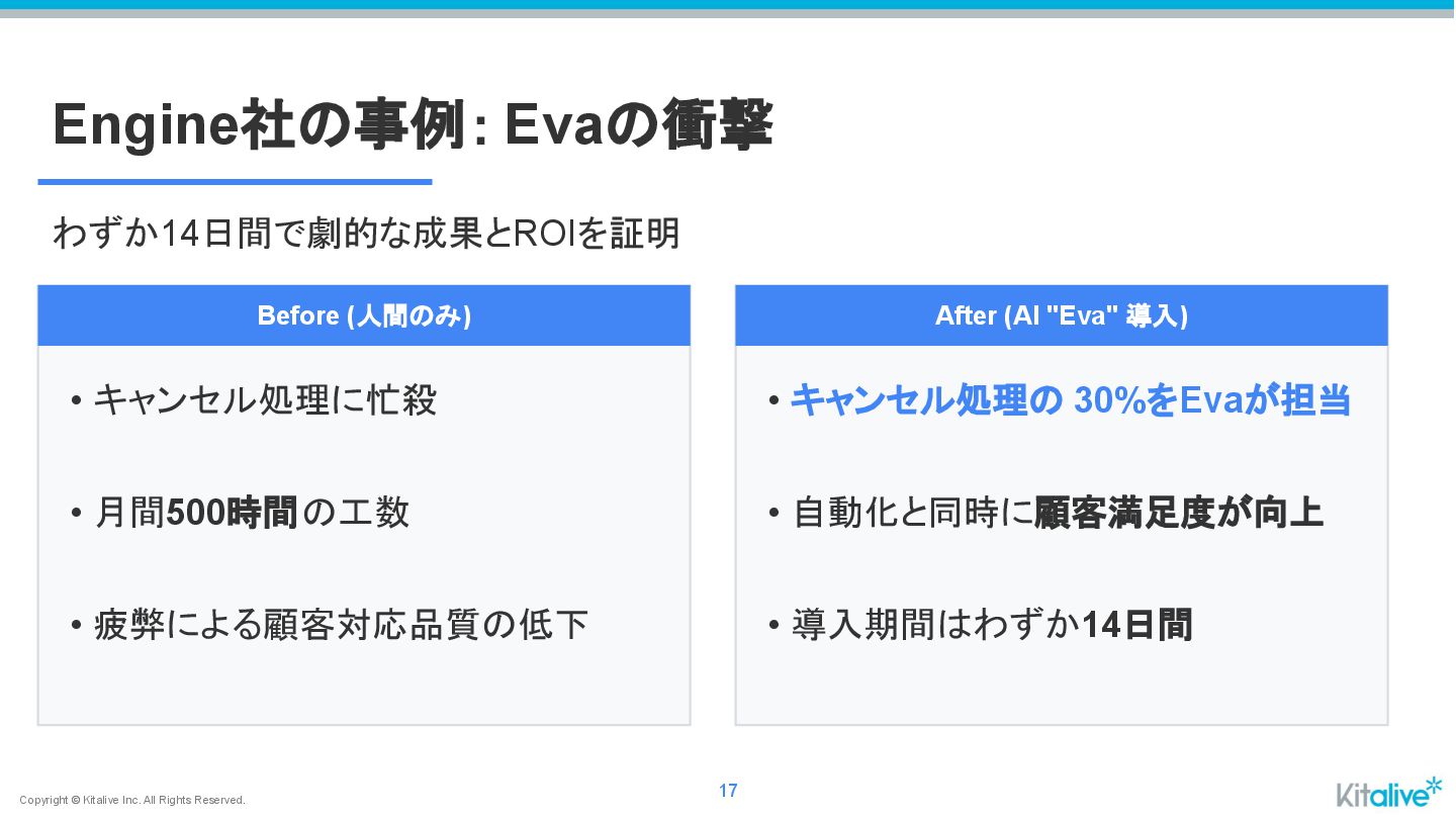 Copyright © Kitalive Inc. All Rights Reserved. Engine社の事例: Evaの衝撃 わずか14日間で劇的な成果とROIを証明