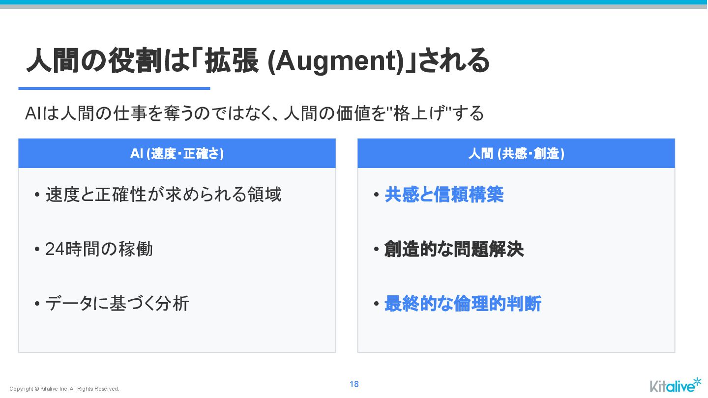 Copyright © Kitalive Inc. All Rights Reserved. 人間の役割は「拡張 (Augment)」される AIは人間の仕事を奪うのではなく、人間の価値を"格上げ"する