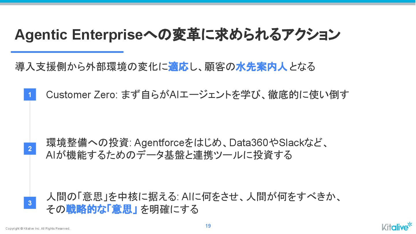 Copyright © Kitalive Inc. All Rights Reserved. Agentic Enterpriseへの変革に求められるアクション 導入支援側から外部環境の変化に適応し、顧客の水先案内人