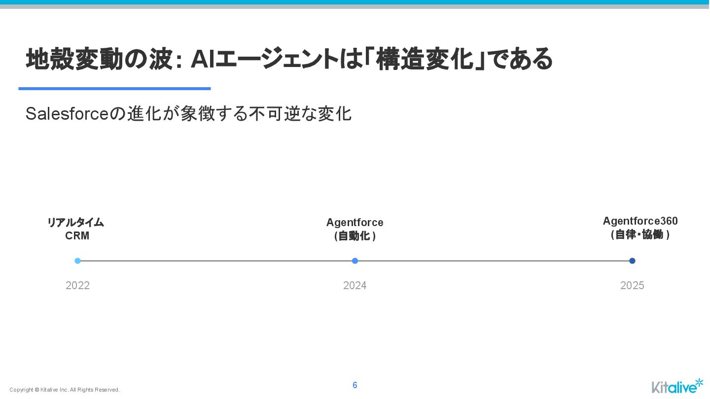 Copyright © Kitalive Inc. All Rights Reserved. 地殻変動の波: AIエージェントは「構造変化」である Salesforceの進化が象徴する不可逆な変化